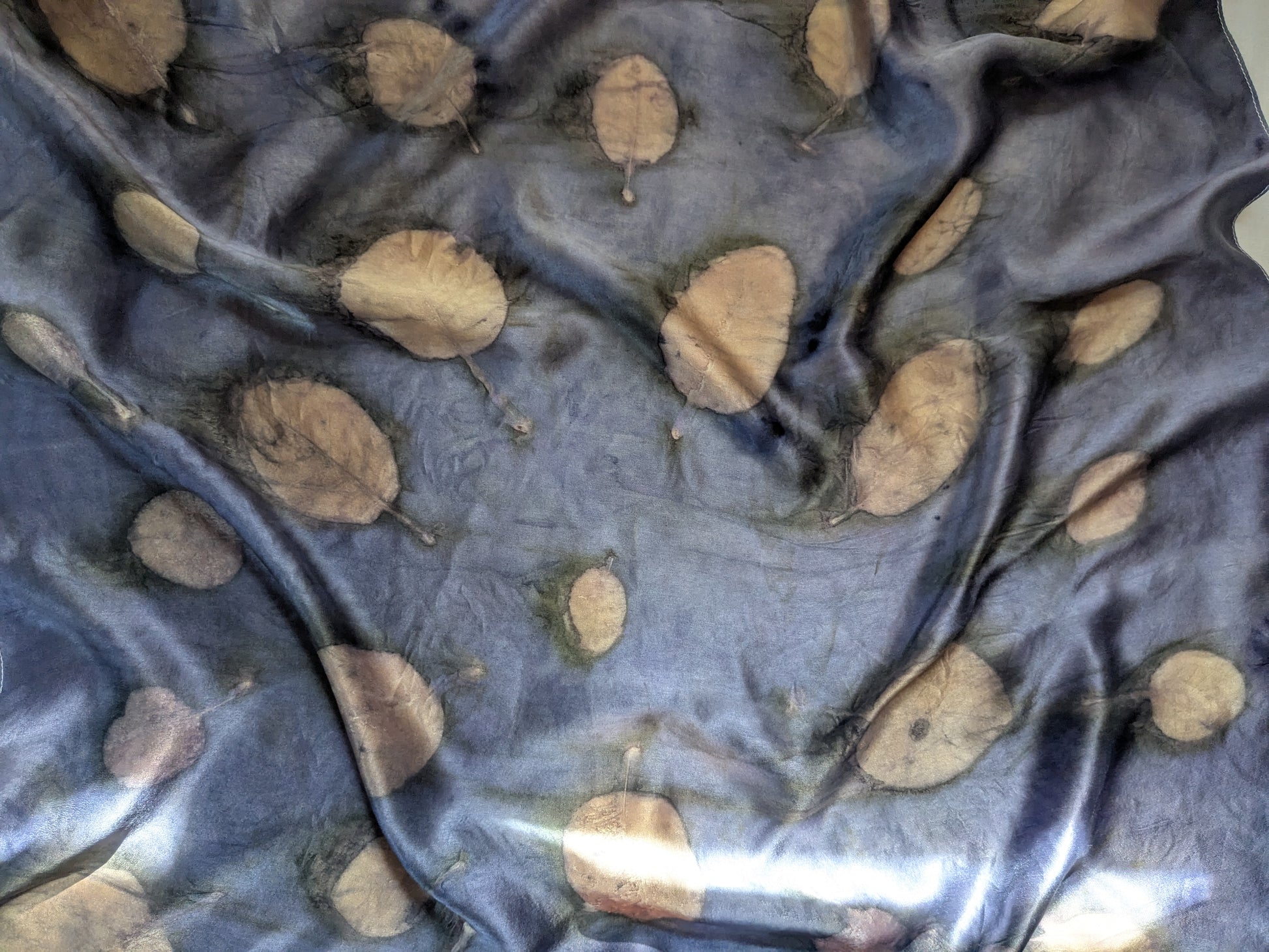 Our scarves are made from 100% natural silk and dyed with real plants grown in our garden. Each scarf is eco-printed with leaves and flowers, creating unique, one-of-a-kind botanical patterns. No two pieces are ever the same, making every scarf a wearable piece of art. Naturally dyed logwood and eco printed with smokebush leaves.