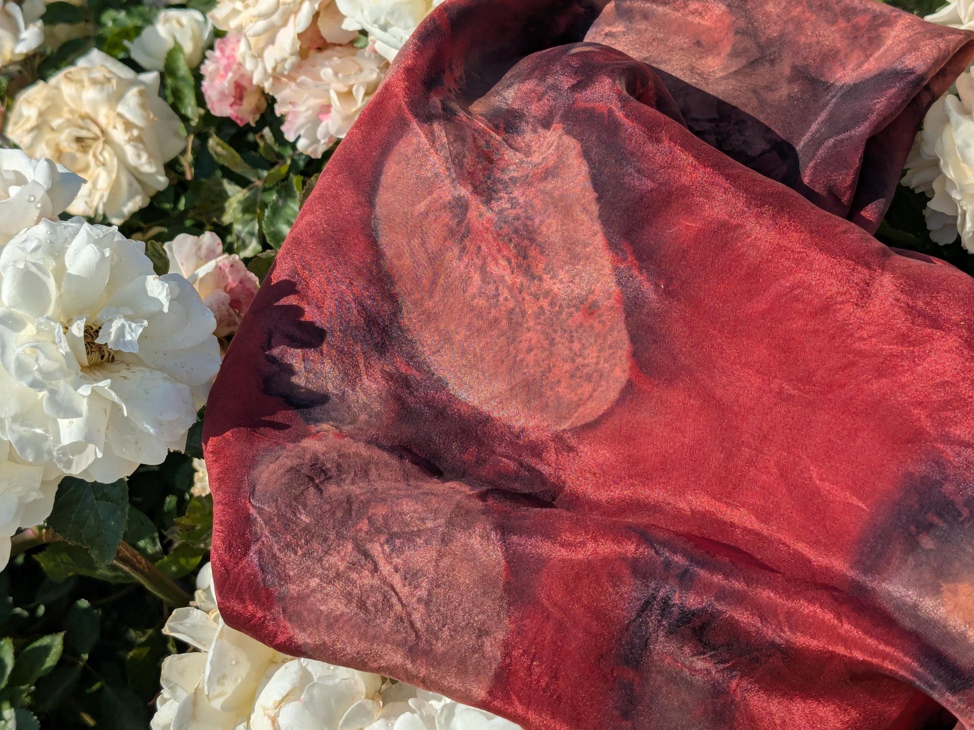 Our scarves are made from 100% natural silk and dyed with real plants grown in our garden. Each scarf is eco-printed with leaves and flowers, creating unique, one-of-a-kind botanical patterns. No two pieces are ever the same, making every scarf a wearable piece of art.