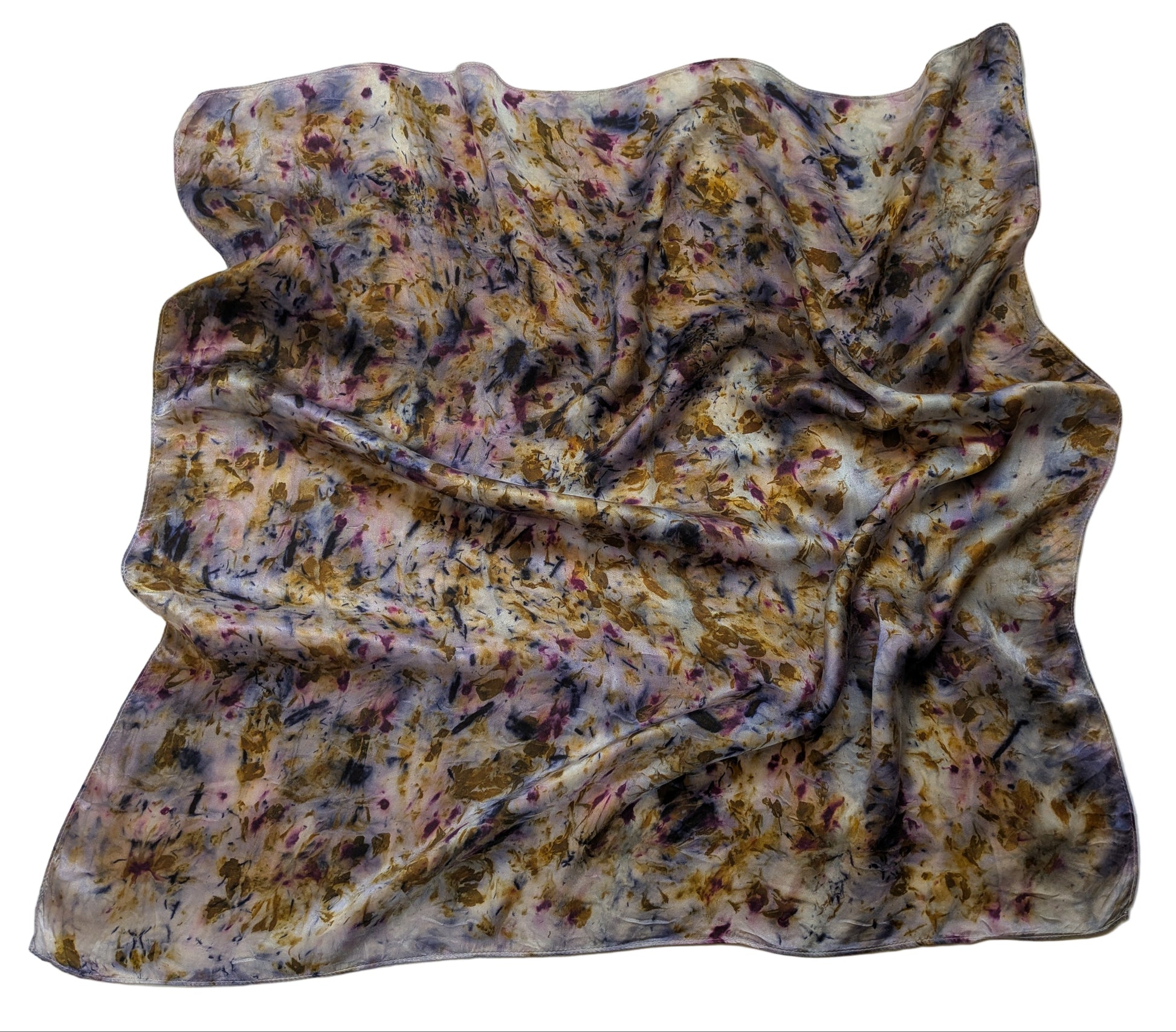 Our scarves are made from 100% natural silk and dyed with real plants grown in our garden. Each scarf is eco-printed with leaves and flowers, creating unique, one-of-a-kind botanical patterns. No two pieces are ever the same, making every scarf a wearable piece of art. Naturally dyed with mix of dyes:marigolds, logwood, madder, cochineal