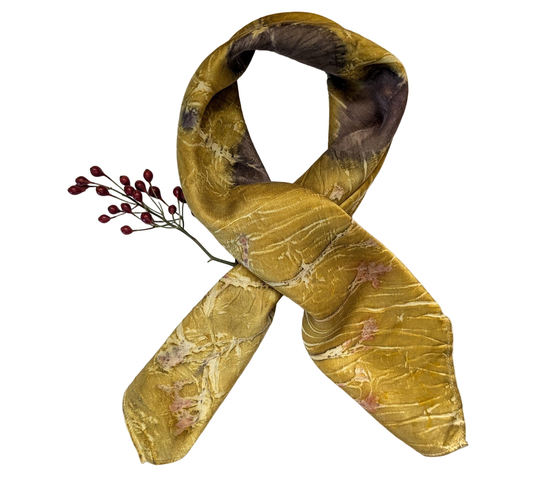 Our scarves are made from 100% natural silk and dyed with real plants grown in our garden. Each scarf is eco-printed with leaves and flowers, creating unique, one-of-a-kind botanical patterns. No two pieces are ever the same, making every scarf a wearable piece of art.