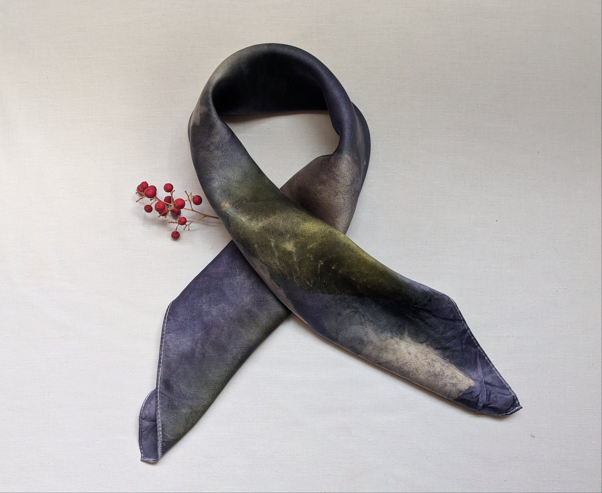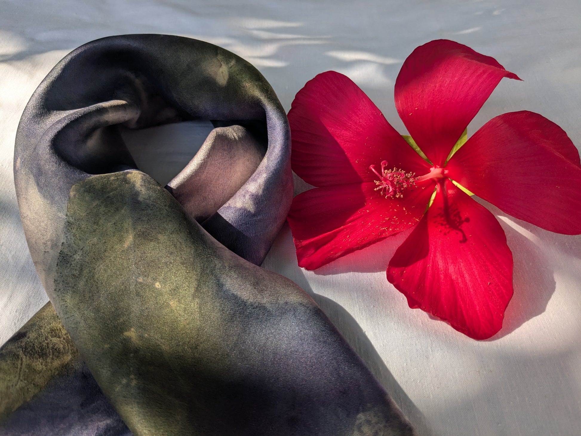 Our scarves are made from 100% natural silk and dyed with real plants grown in our garden. Each scarf is eco-printed with leaves and flowers, creating unique, one-of-a-kind botanical patterns. No two pieces are ever the same, making every scarf a wearable piece of art. Eco printed natural silk satin scarf, logwood and various leaves.