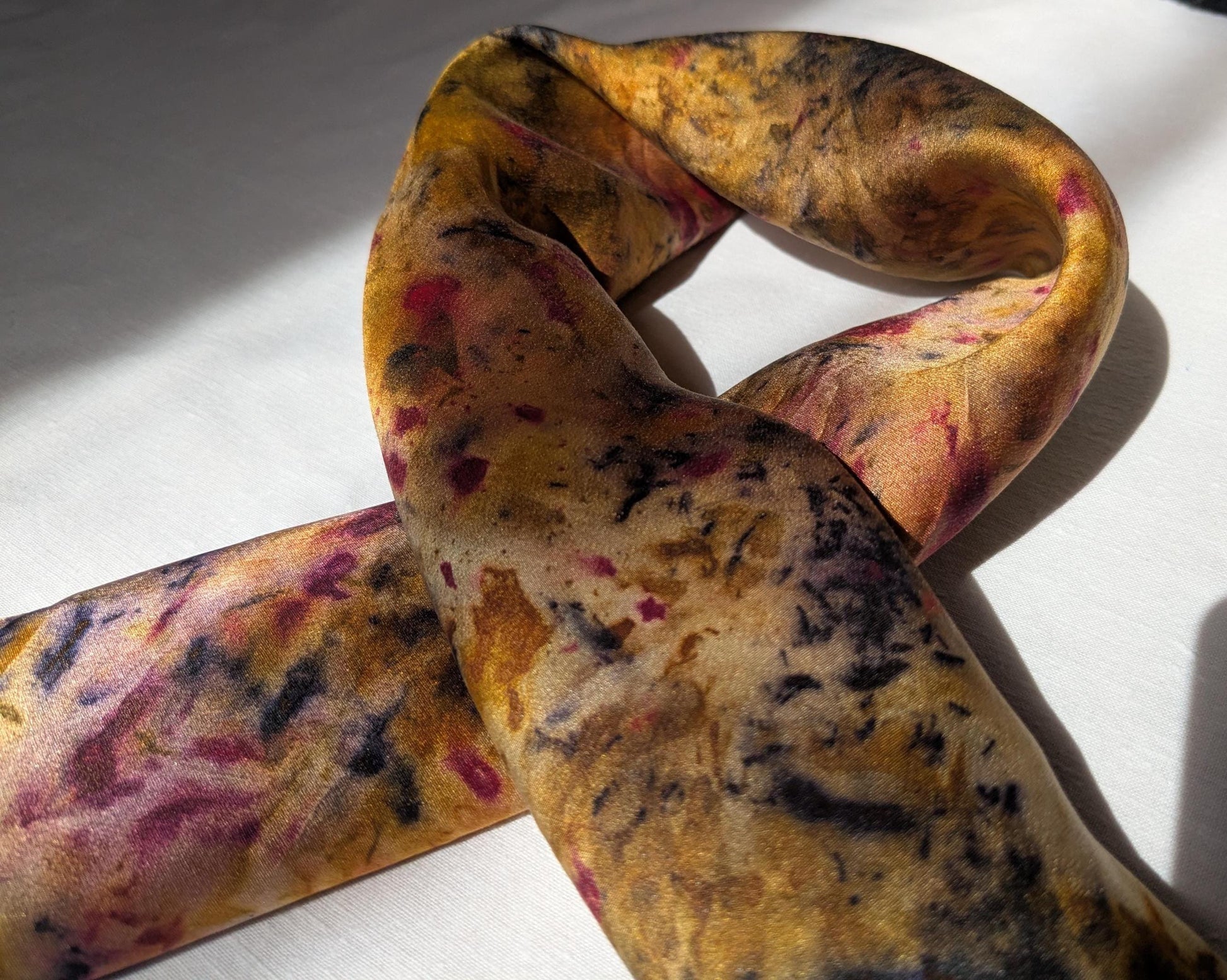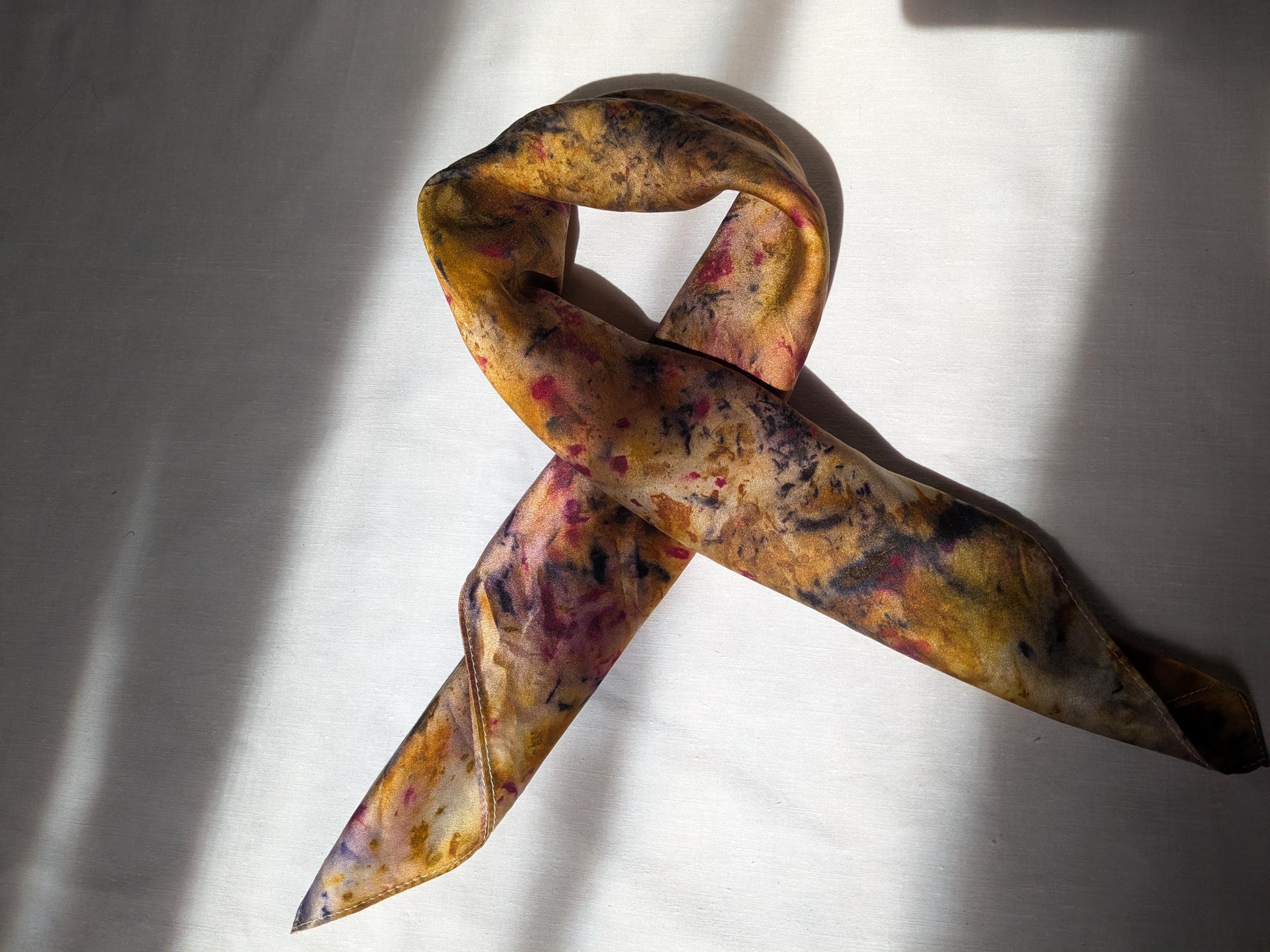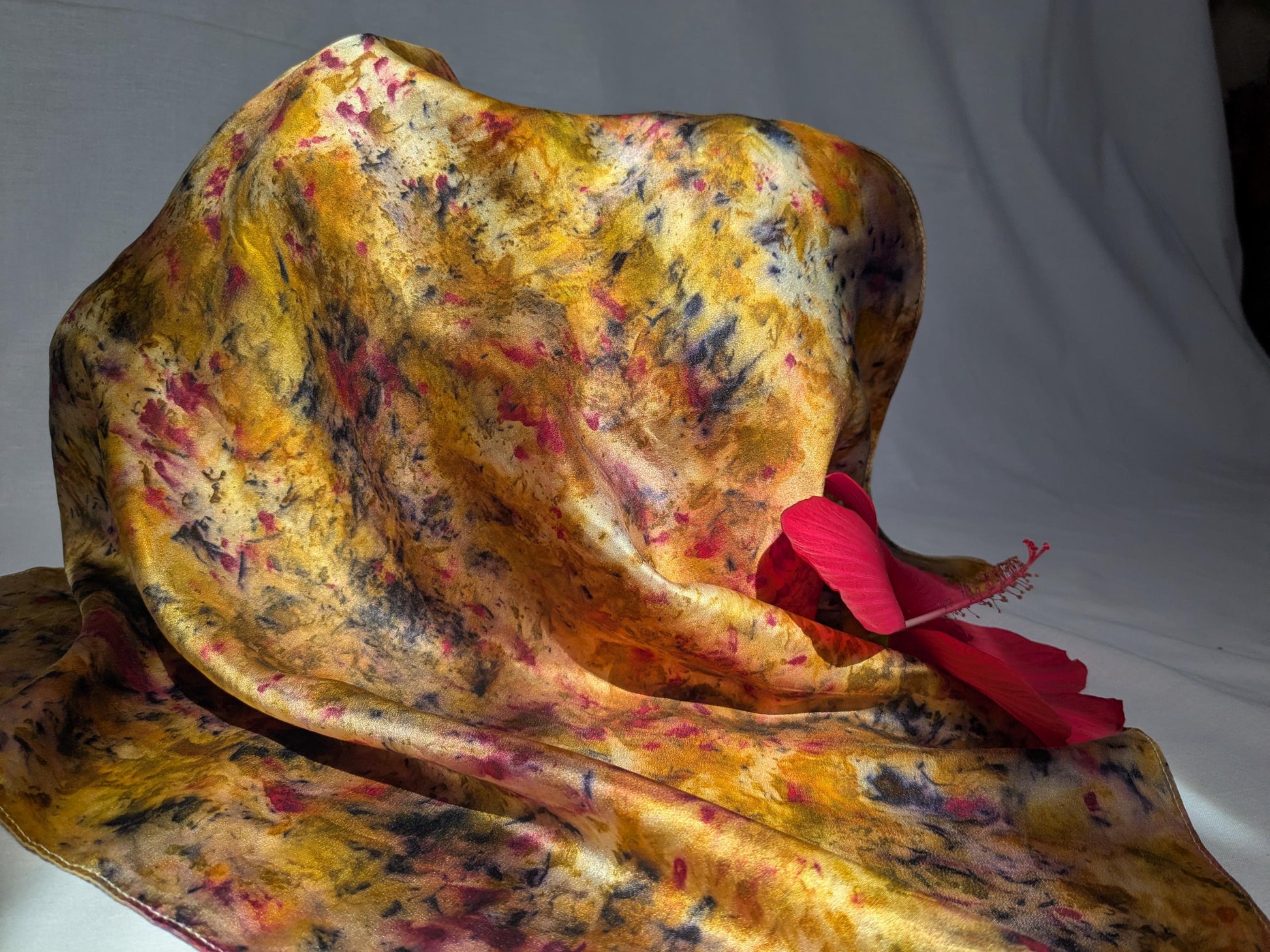 Plant dyed natural silk scarf: marigolds, madder, logwood and cochineal