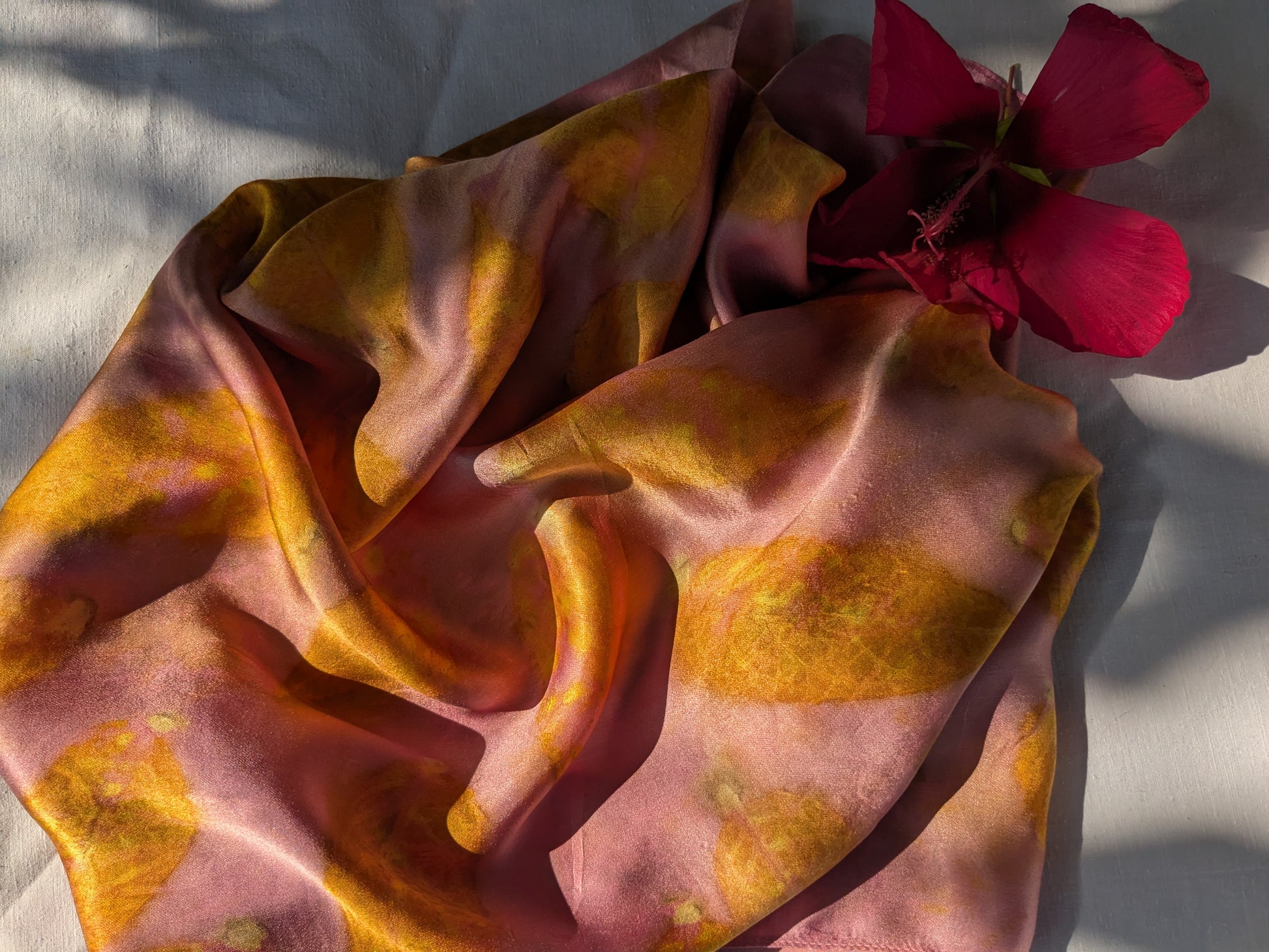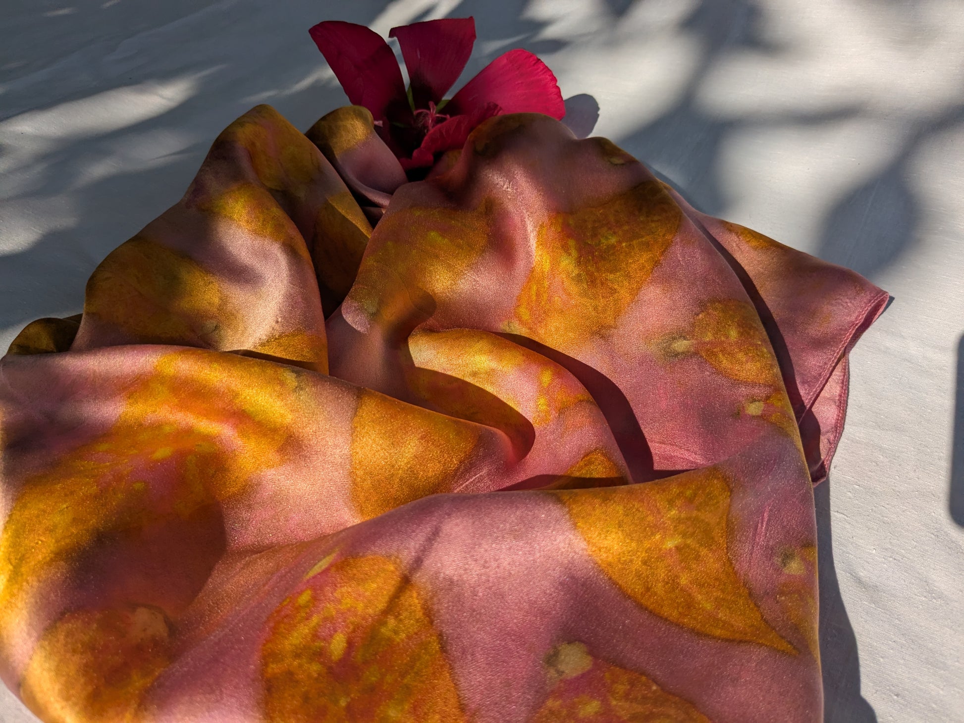 Our scarves are made from 100% natural silk and dyed with real plants grown in our garden. Each scarf is eco-printed with leaves and flowers, creating unique, one-of-a-kind botanical patterns. No two pieces are ever the same, making every scarf a wearable piece of art. Made with sumac leaves and dyed with cochineal.