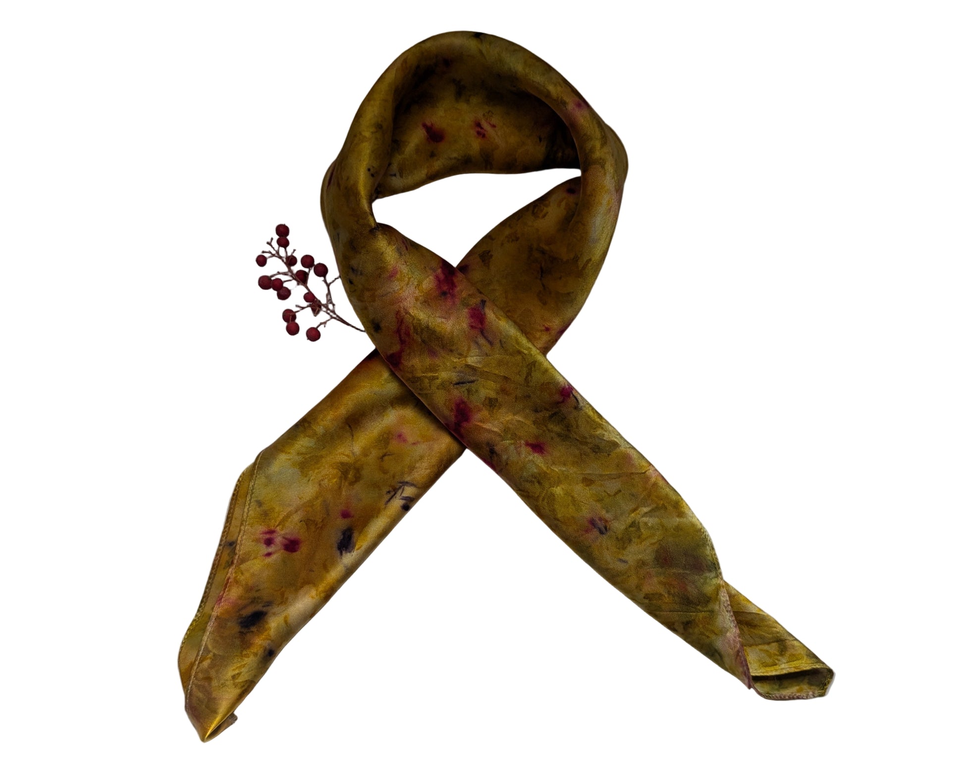შარფი დამზადებულია 100% ბუნებრივი აბრეშუმისგან და შეღებილია ნამდვილი მცენარეებისგან; აღბეჭდილია ასევე ნამდვილი, ჩემს ბაღში გაზრდილი მცენარეების ფოთლები და ყვავილები: ზაფრანას ყვავილი, ხახვის ფურცლები, კოშინელი