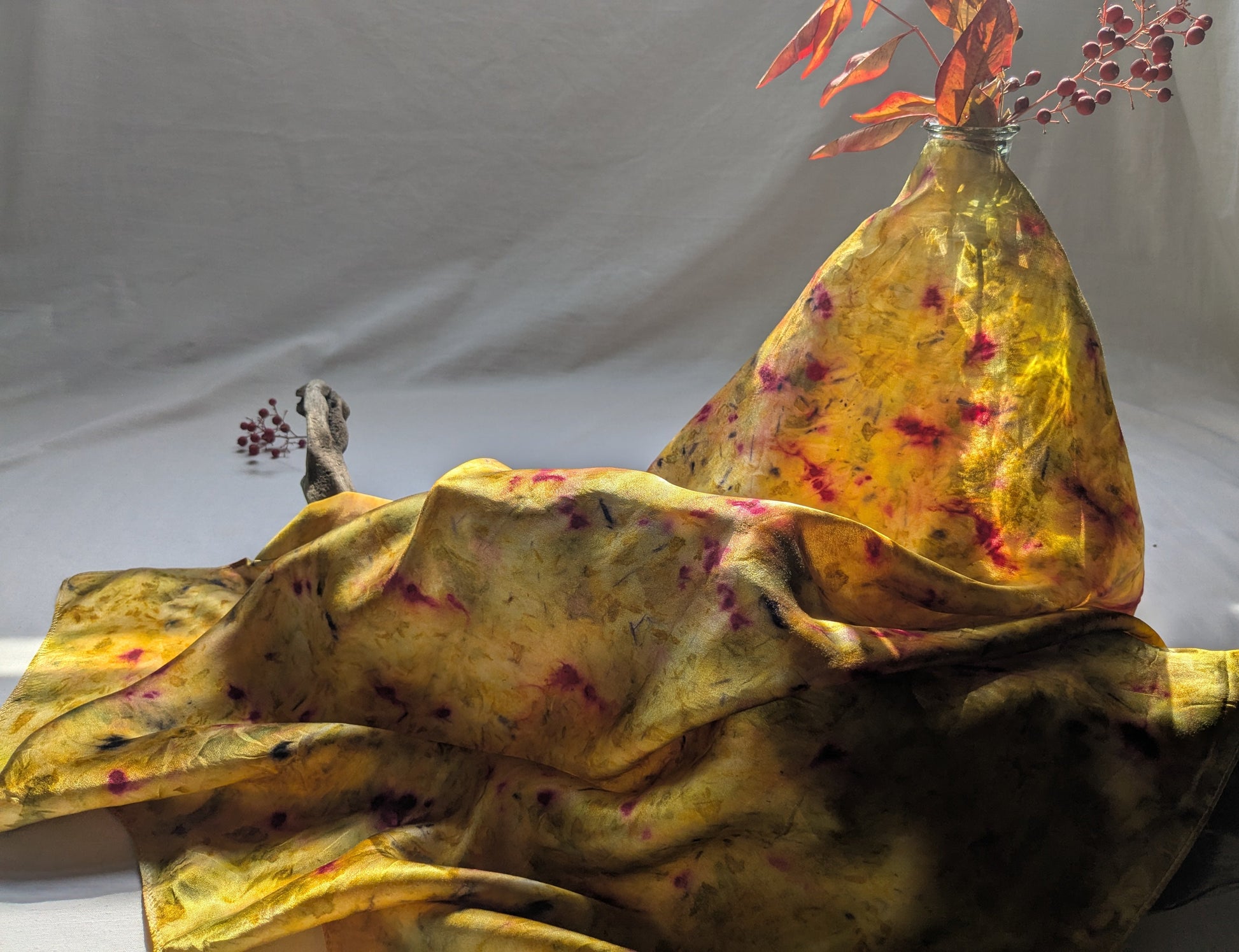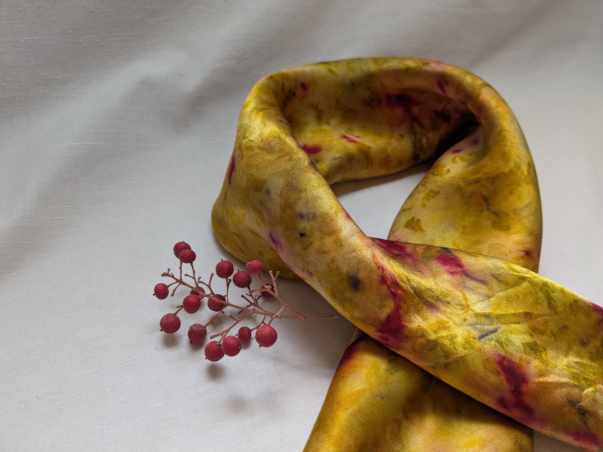 ყვითელი აბრეშუმის შარფი, კოშინელის და ხახვის ფურცლების წვეთებით