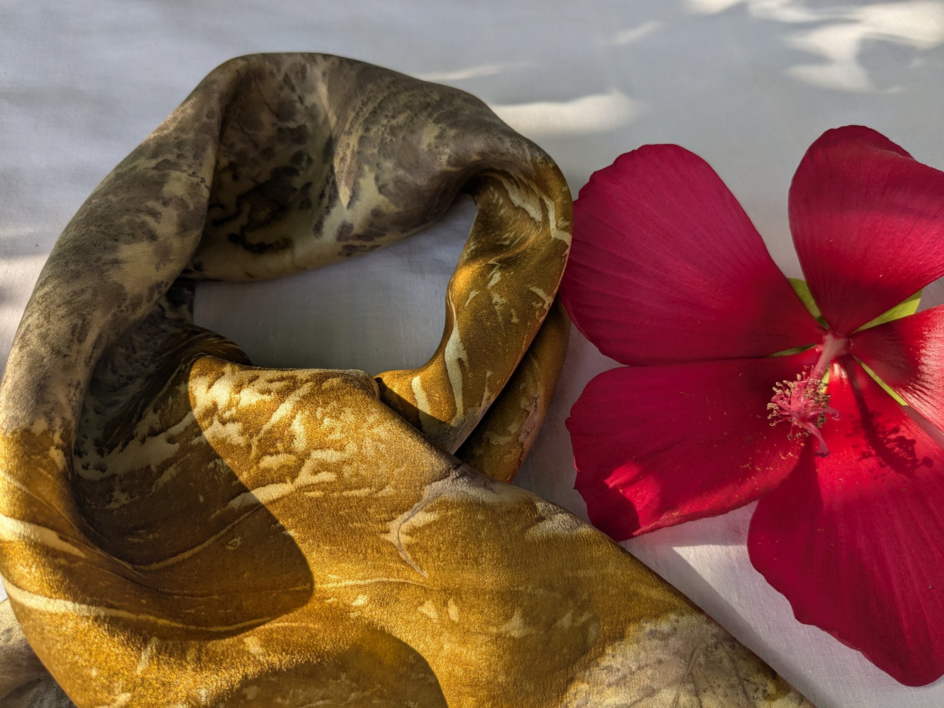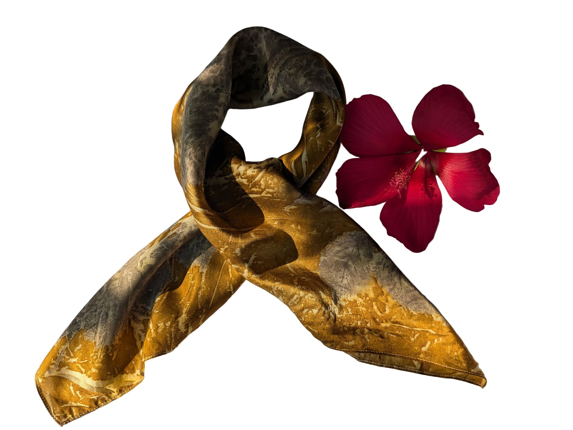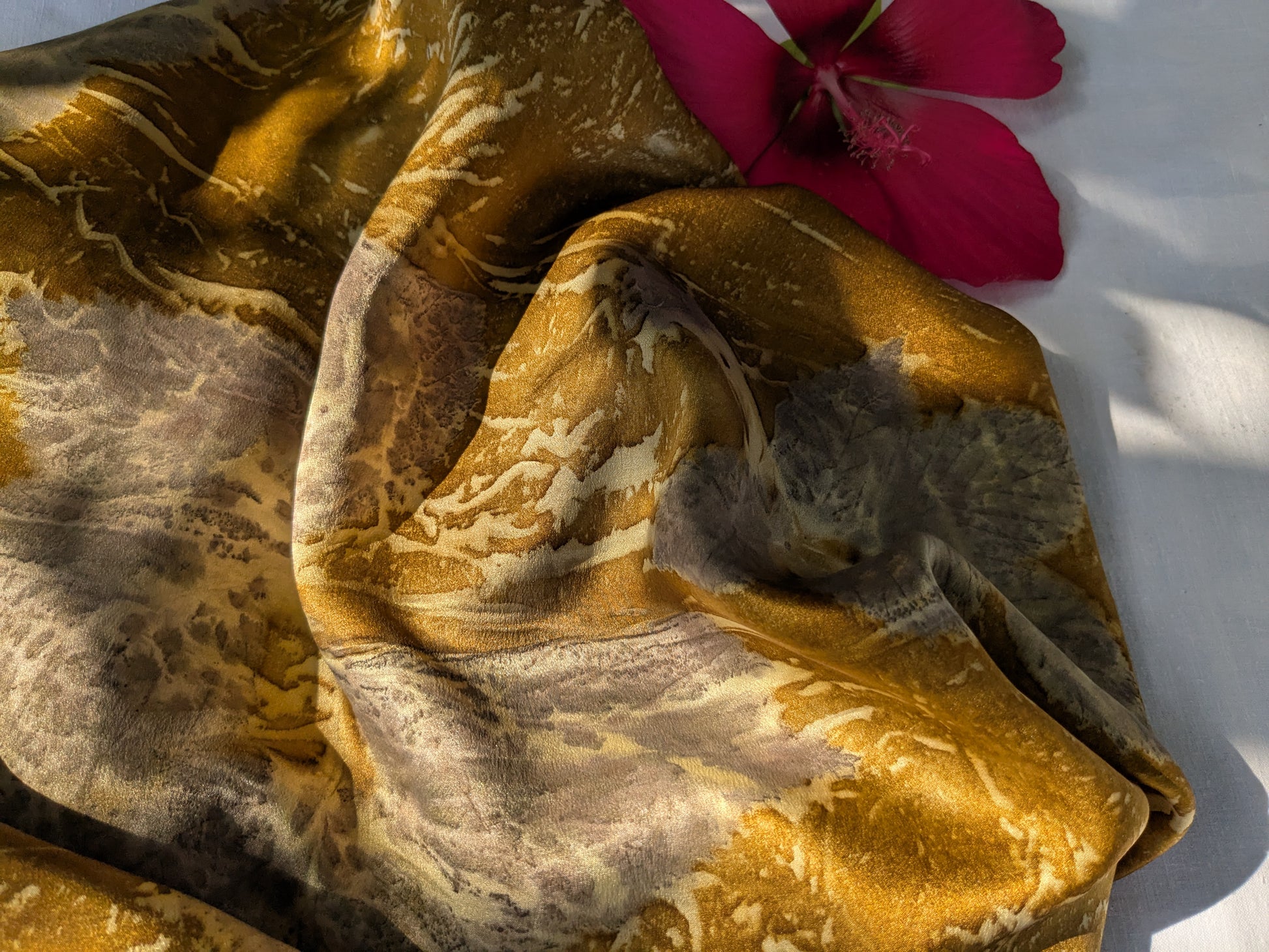 შარფი დამზადებულია 100% ბუნებრივი აბრეშუმისგან და შეღებილია ნამდვილი მცენარეებისგან; აღბეჭდილია ასევე ნამდვილი, ჩემს ბაღში გაზრდილი მცენარეების ფოთლები და ყვავილები: ზაფრანას ყვავილი და სხვადასხვა ფოთლები.
