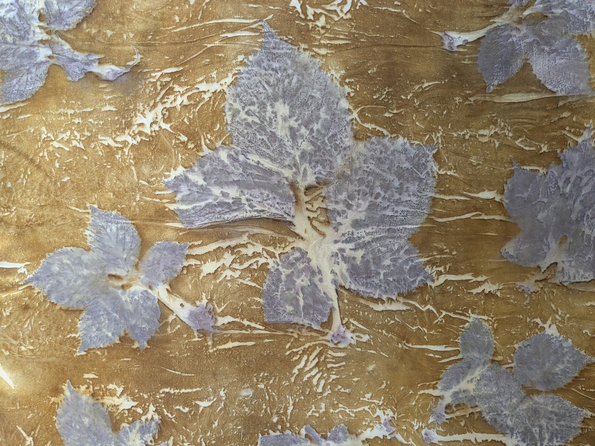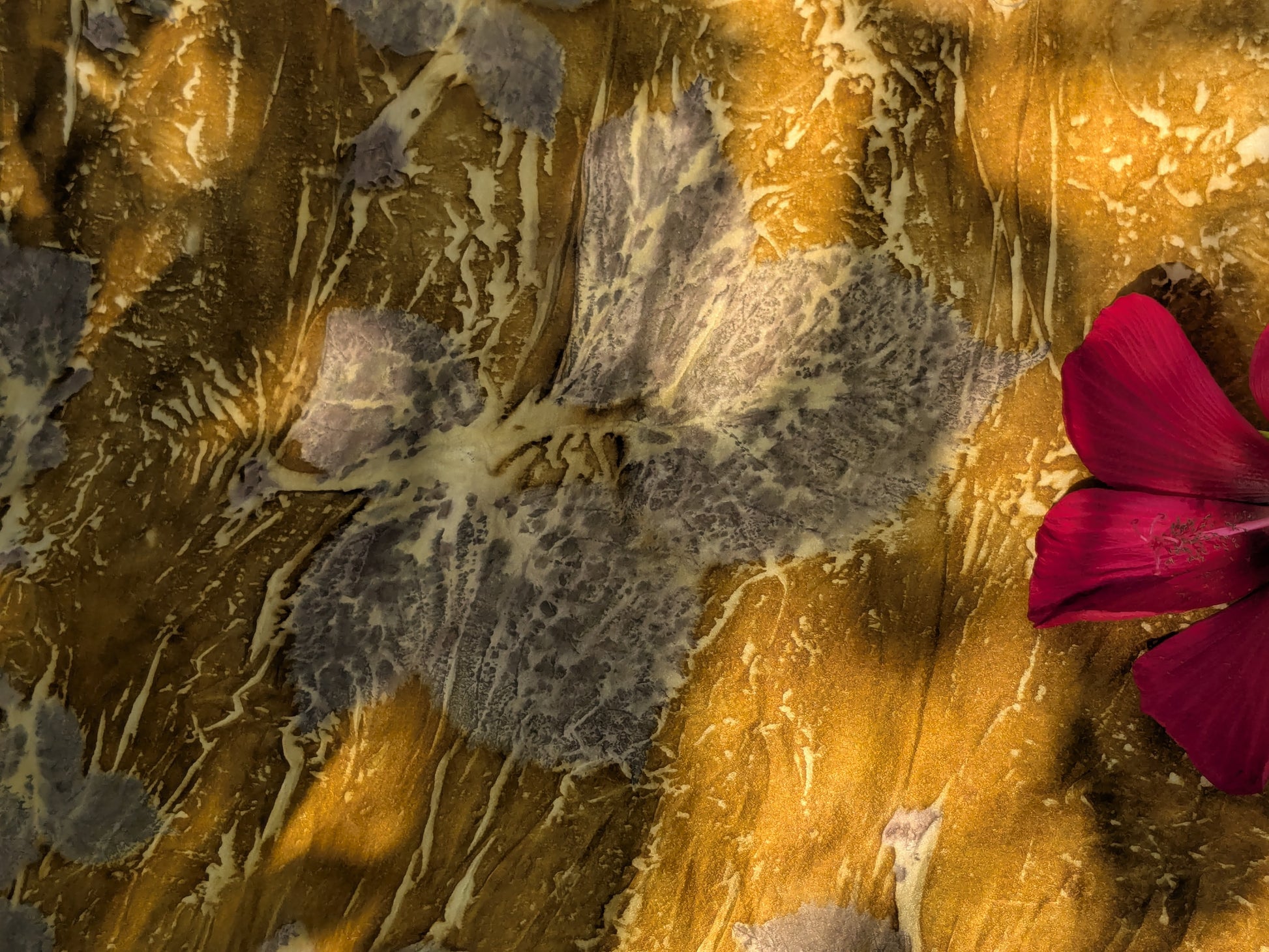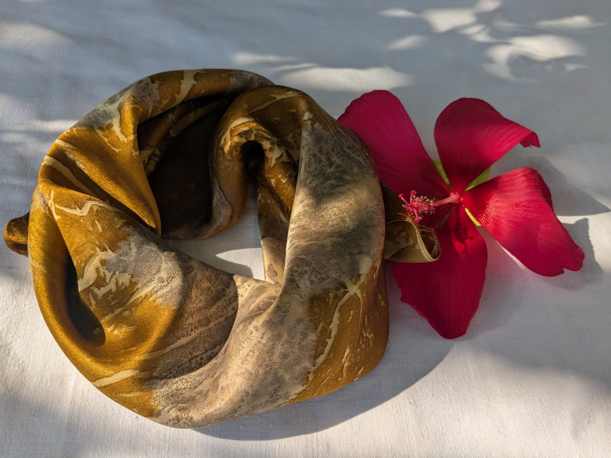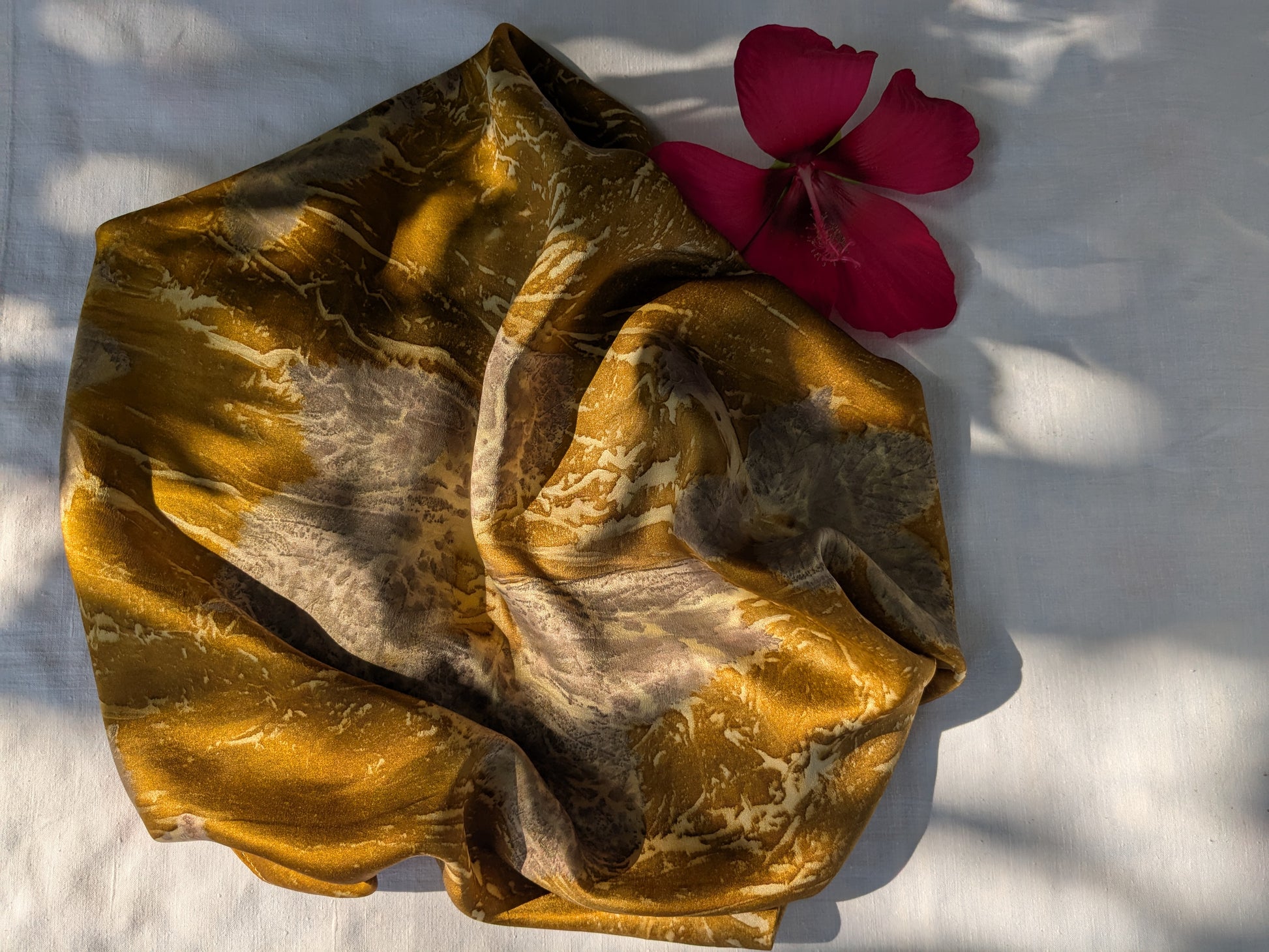 შარფი დამზადებულია 100% ბუნებრივი აბრეშუმისგან და შეღებილია ნამდვილი მცენარეებისგან; აღბეჭდილია ასევე ნამდვილი, ჩემს ბაღში გაზრდილი მცენარეების ფოთლები და ყვავილები: ზაფრანას ყვავილი და სხვადასხვა ფოთლები.