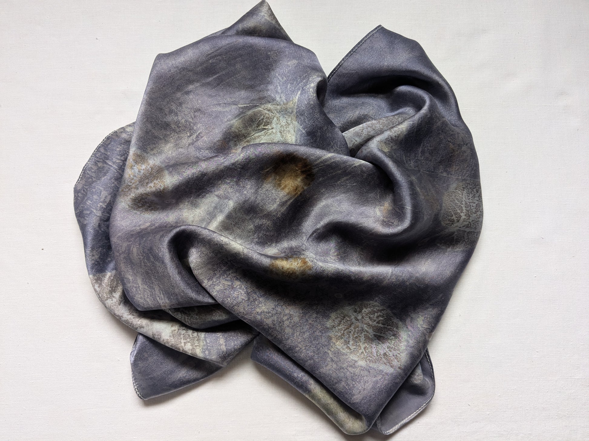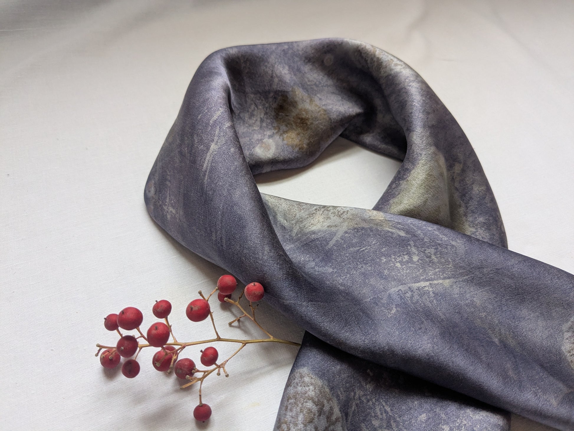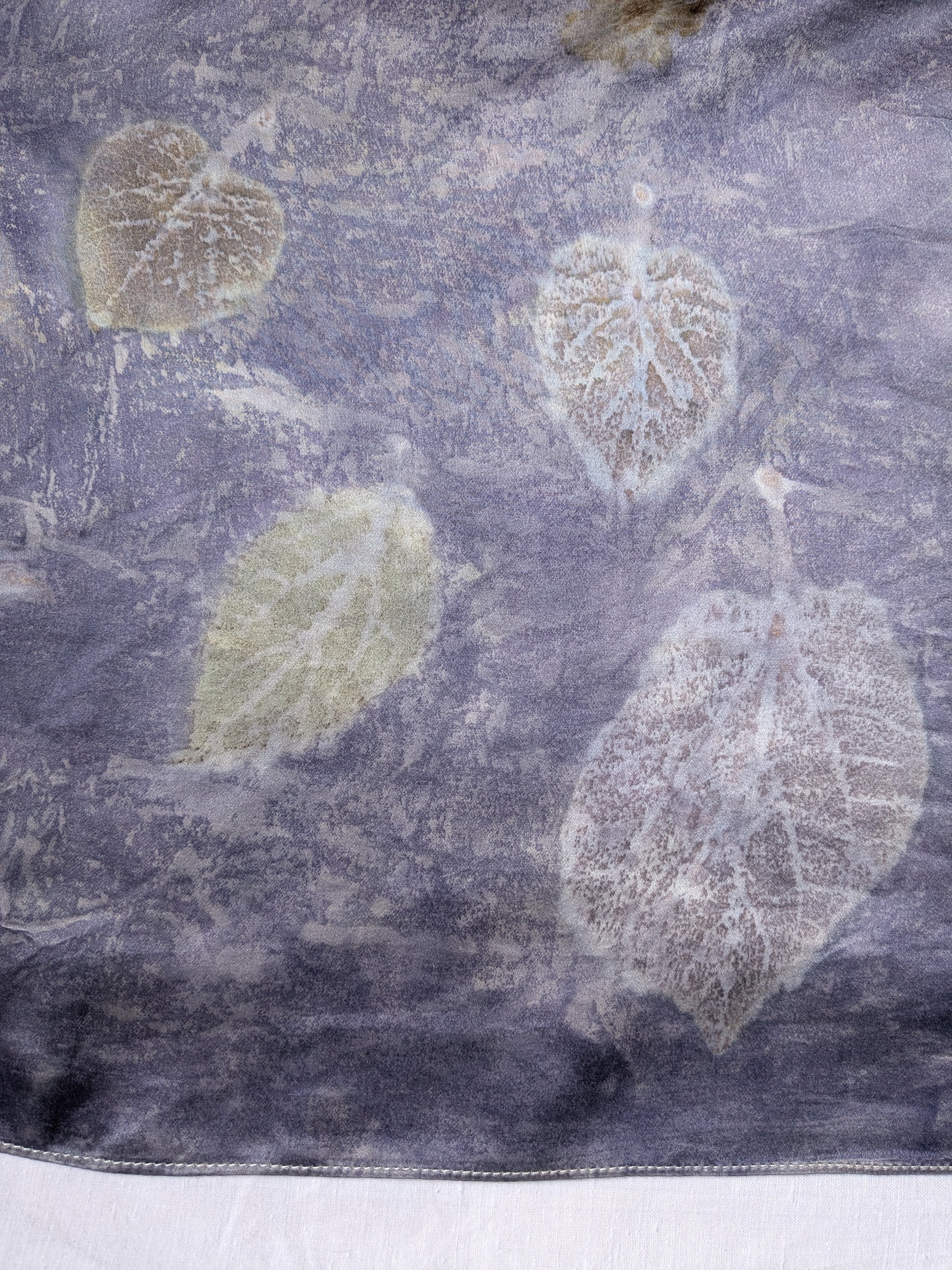 შარფი დამზადებულია 100% ბუნებრივი აბრეშუმისგან და შეღებილია ნამდვილი მცენარეებისგან; აღბეჭდილია ასევე ნამდვილი, ჩემს ბაღში გაზრდილი მცენარეების ფოთლები და ყვავილები: სანდალოზი, იუდას ხე და ხავერდა.