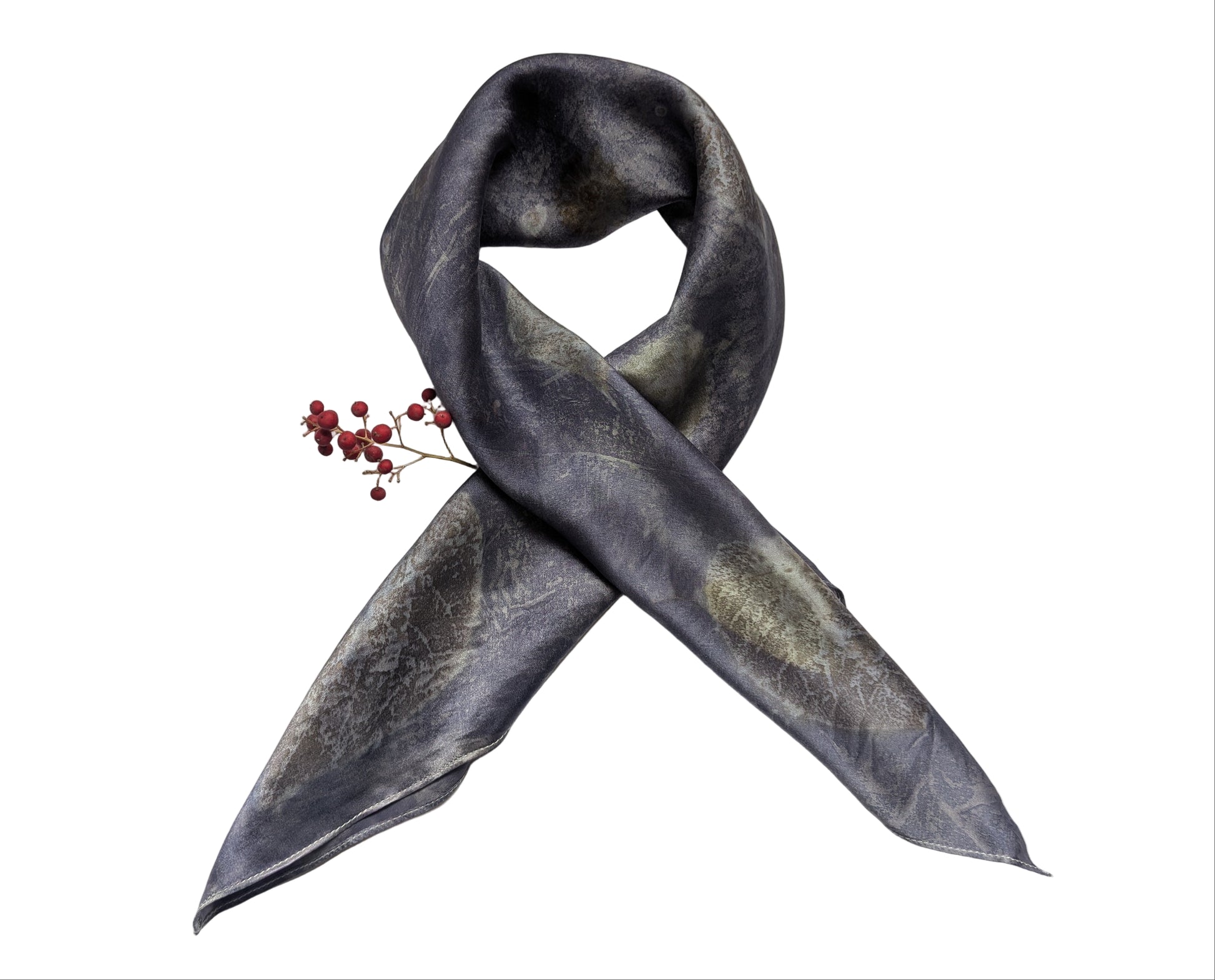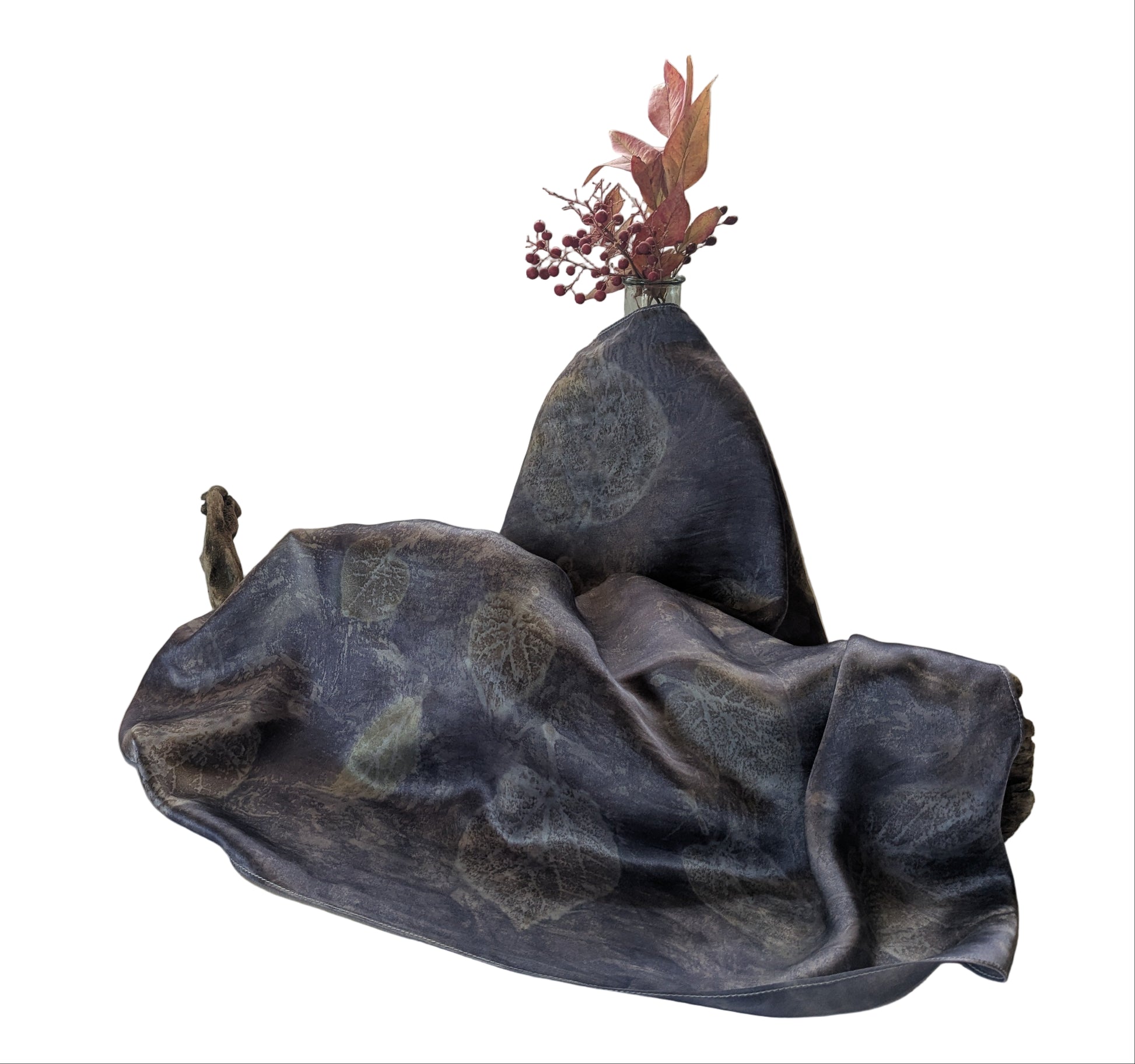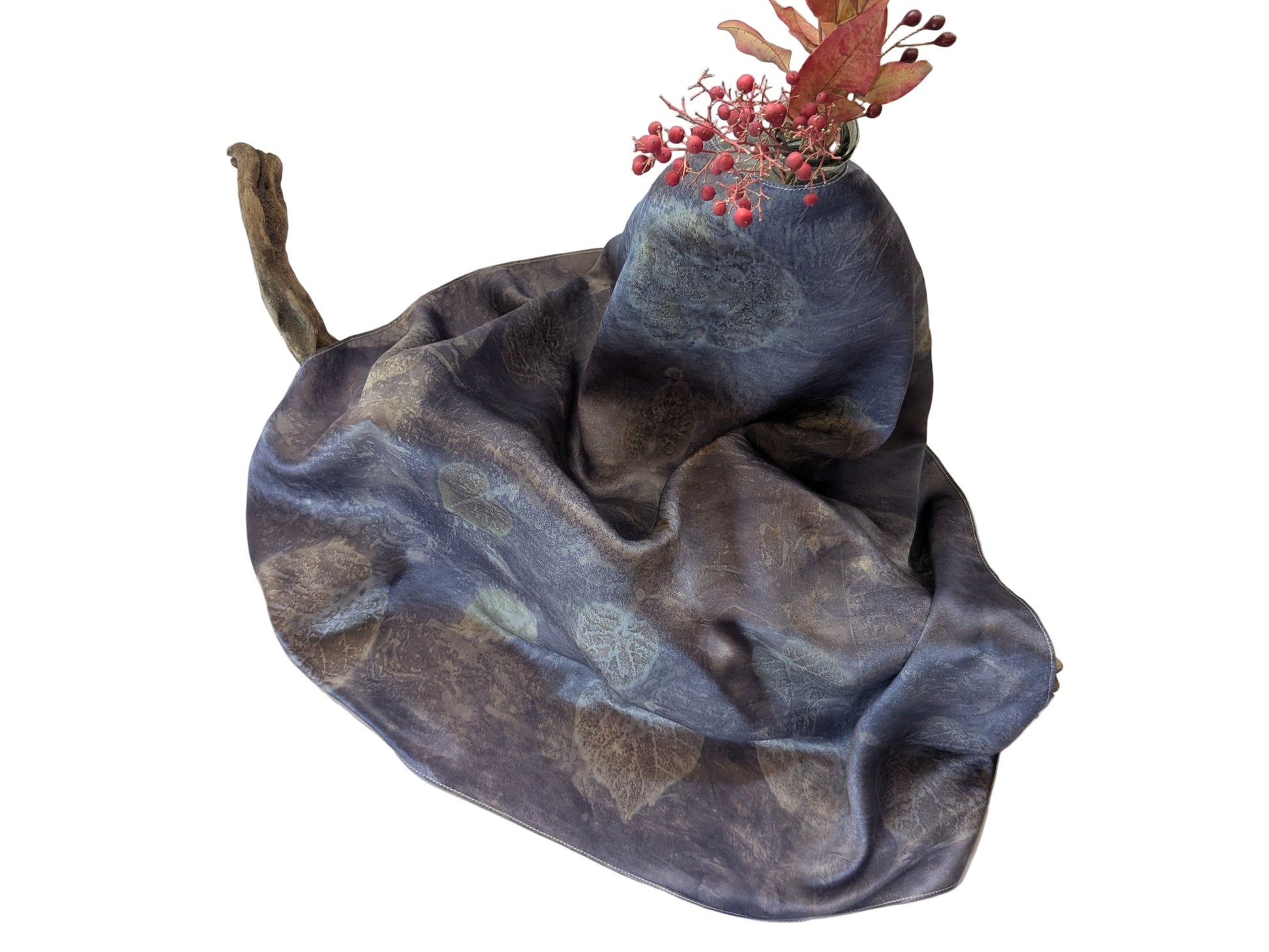 შარფი დამზადებულია 100% ბუნებრივი აბრეშუმისგან და შეღებილია ნამდვილი მცენარეებისგან; აღბეჭდილია ასევე ნამდვილი, ჩემს ბაღში გაზრდილი მცენარეების ფოთლები და ყვავილები: სანდალოზი, იუდას ხე და ხავერდა.