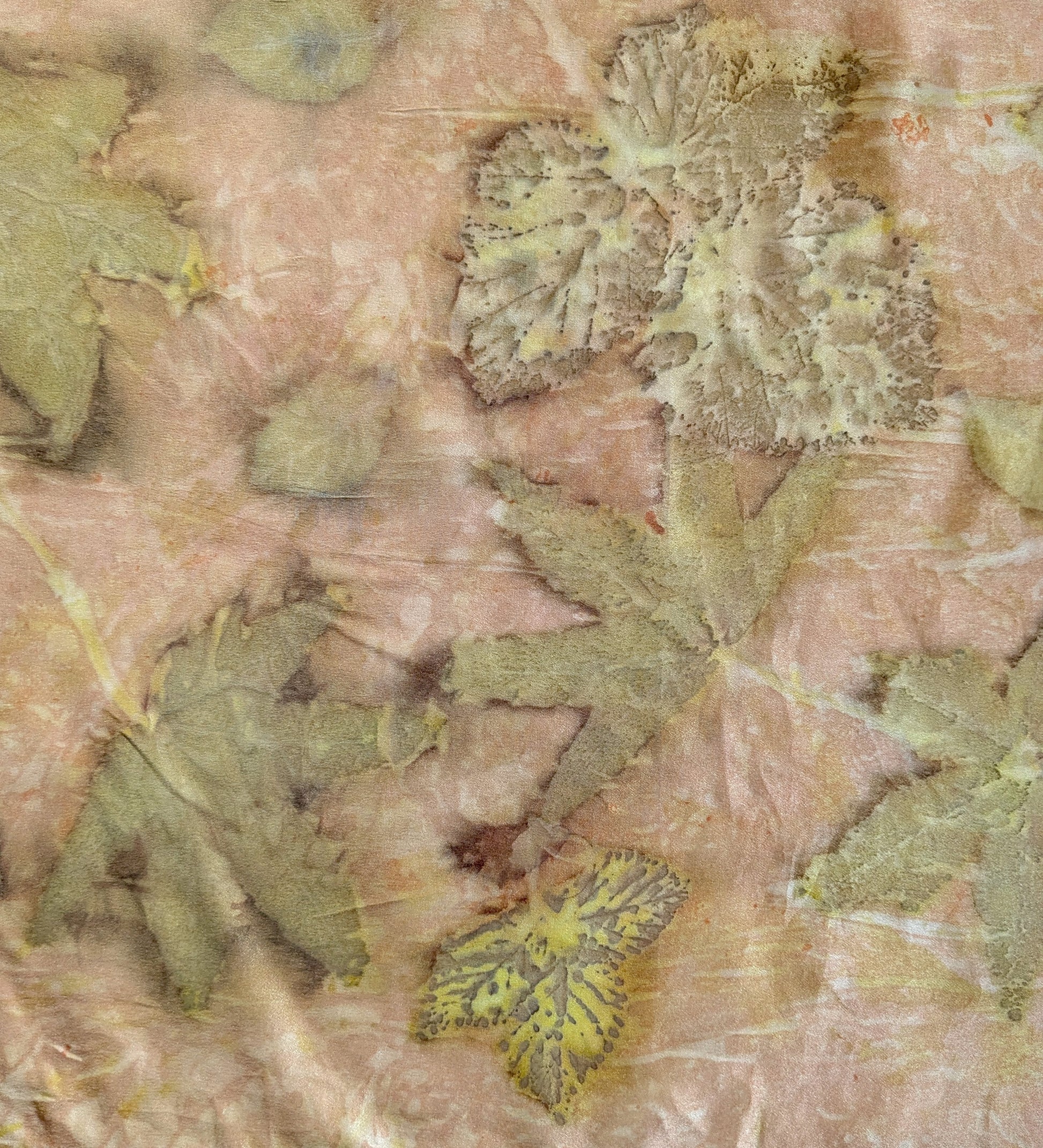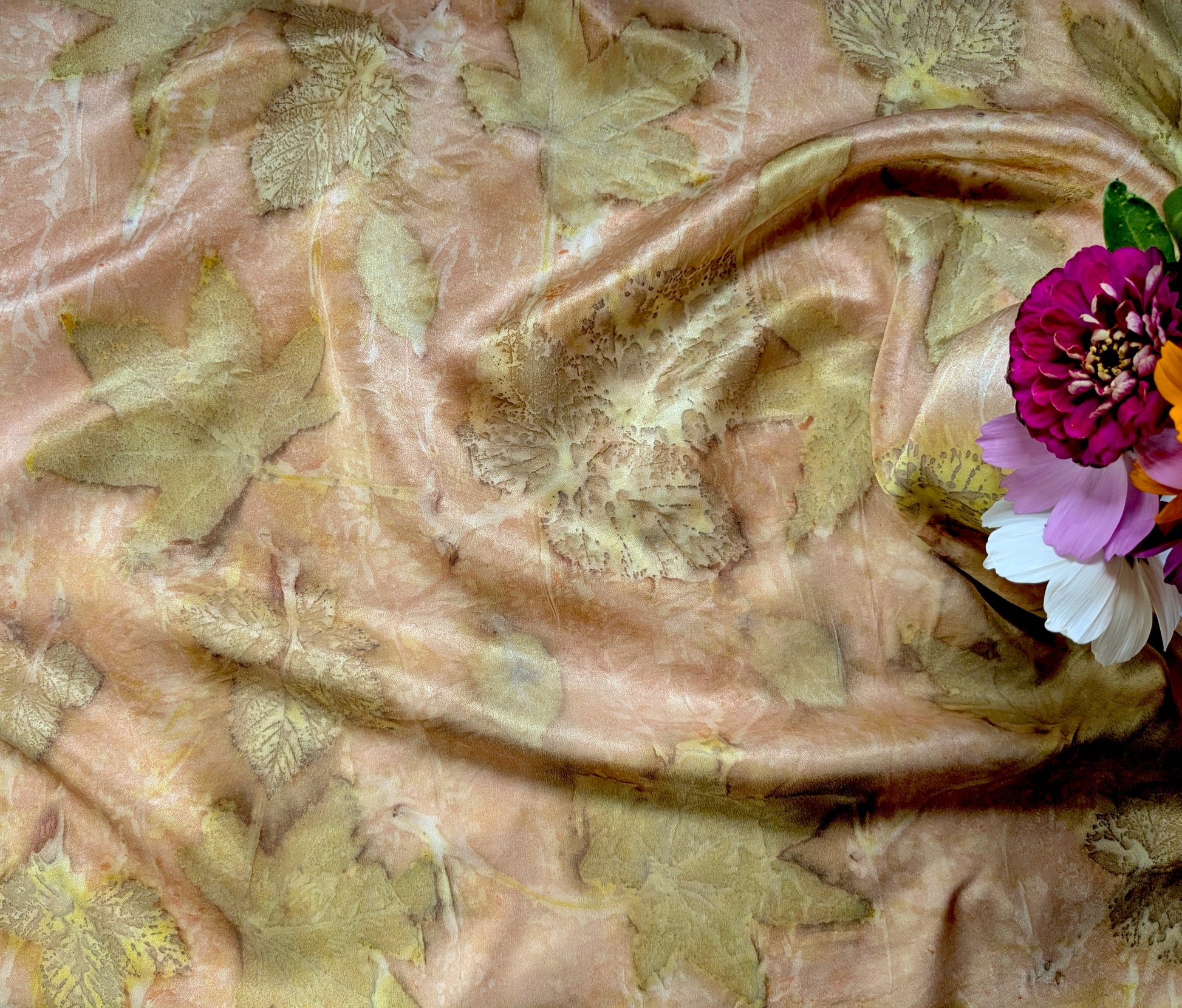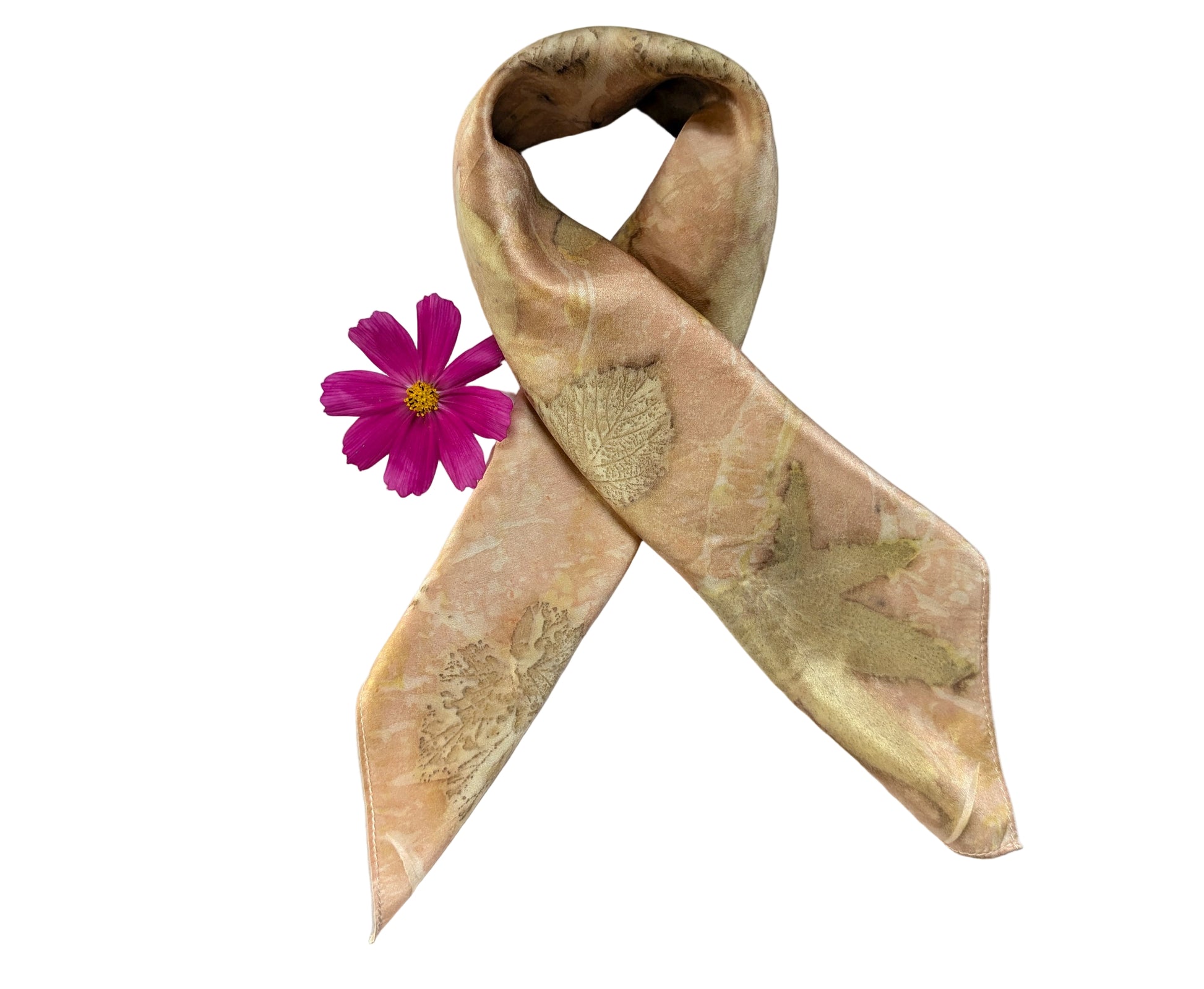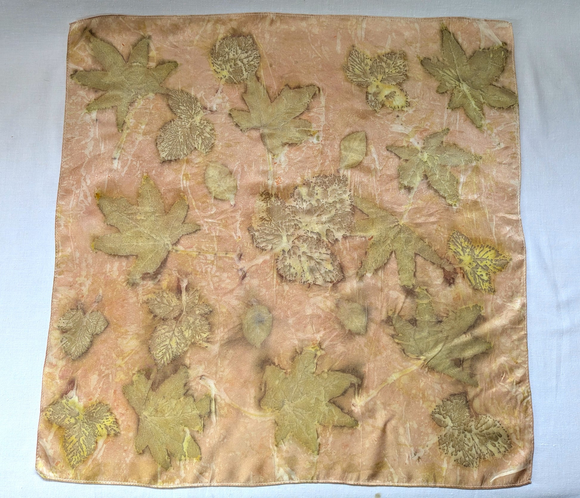 შარფი დამზადებულია 100% ბუნებრივი აბრეშუმისგან და შეღებილია ნამდვილი მცენარეებისგან; აღბეჭდილია ასევე ნამდვილი, ჩემს ბაღში გაზრდილი მცენარეების ფოთლები და ყვავილები: სხვადასხვა ფოთლები და ენდრო.