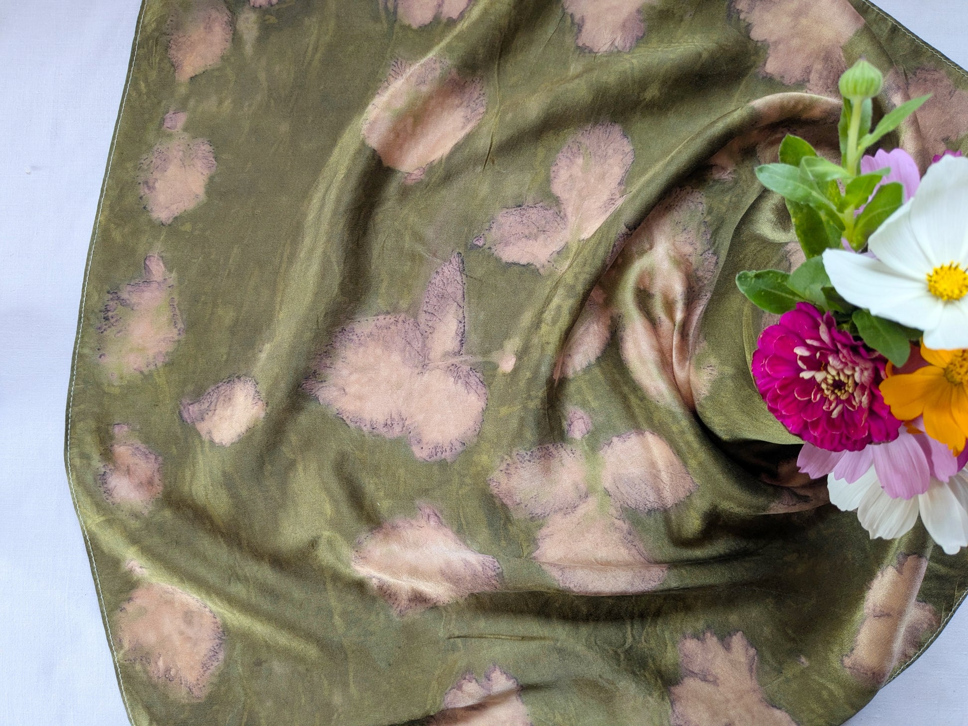 ბუნებრივად შეღებილი მწვანე ნატურალური აბრეშუმის შარფი, ეკო პრინტით აღბეჭდილი იასამნისფერი ფოთლებით