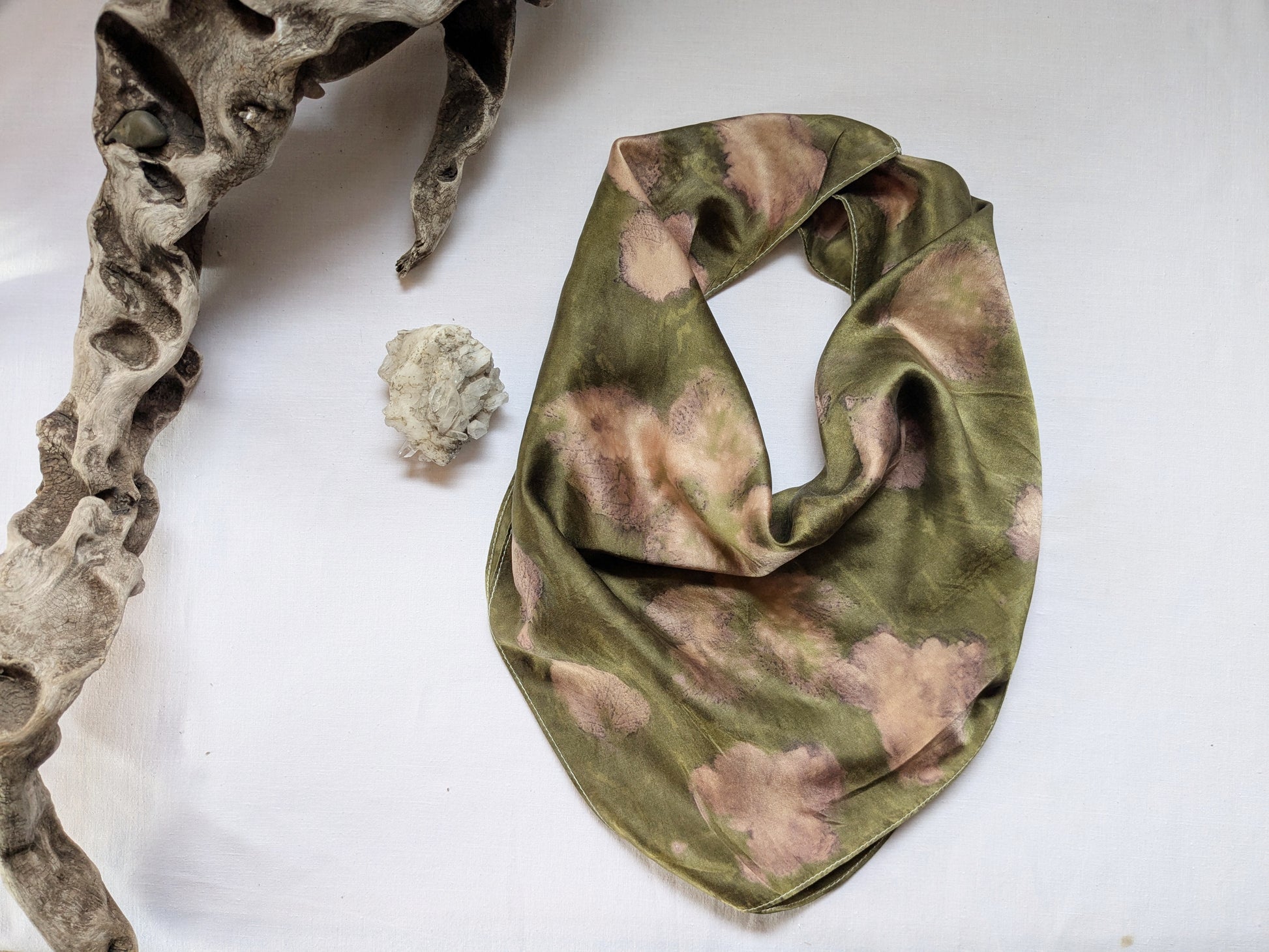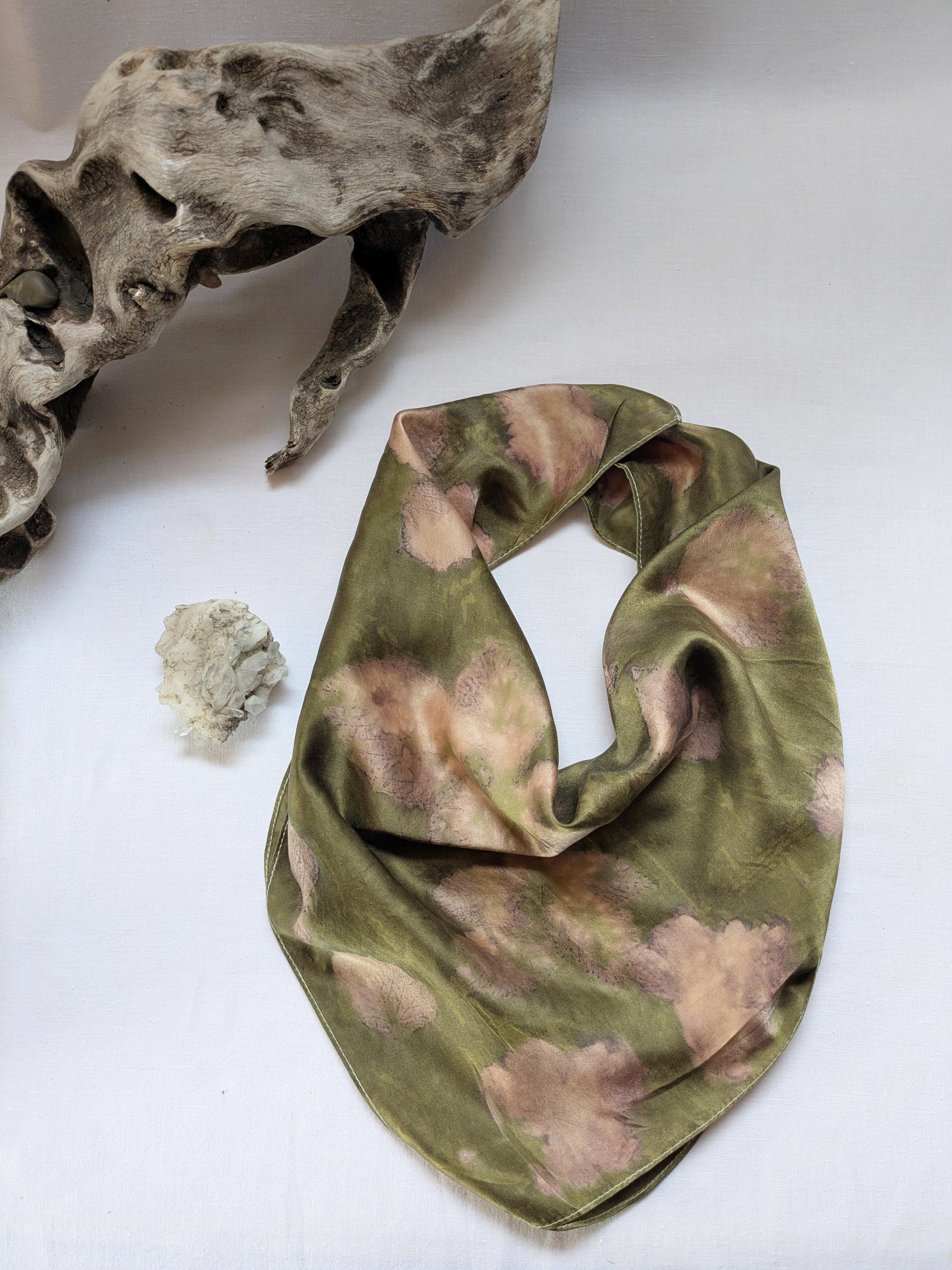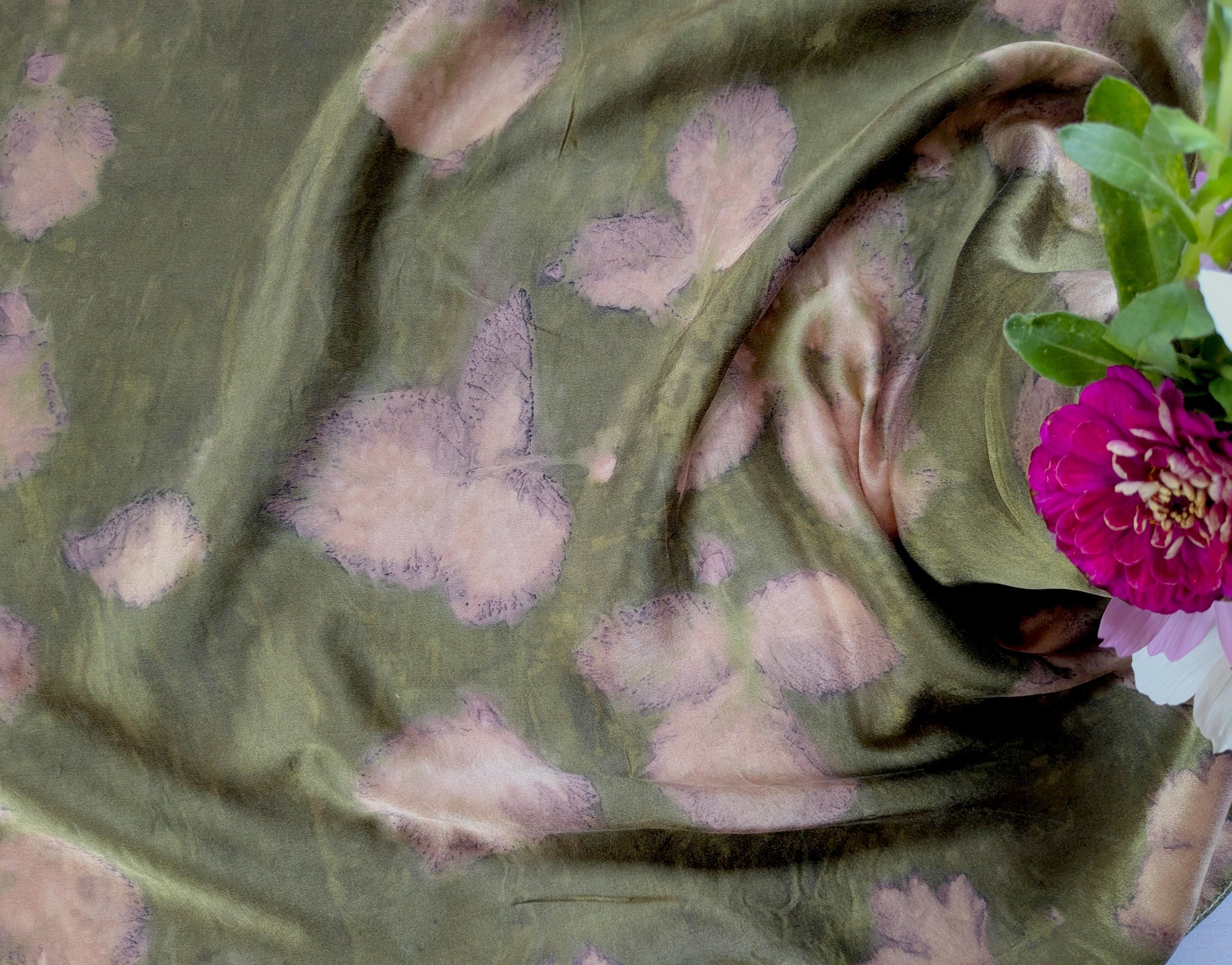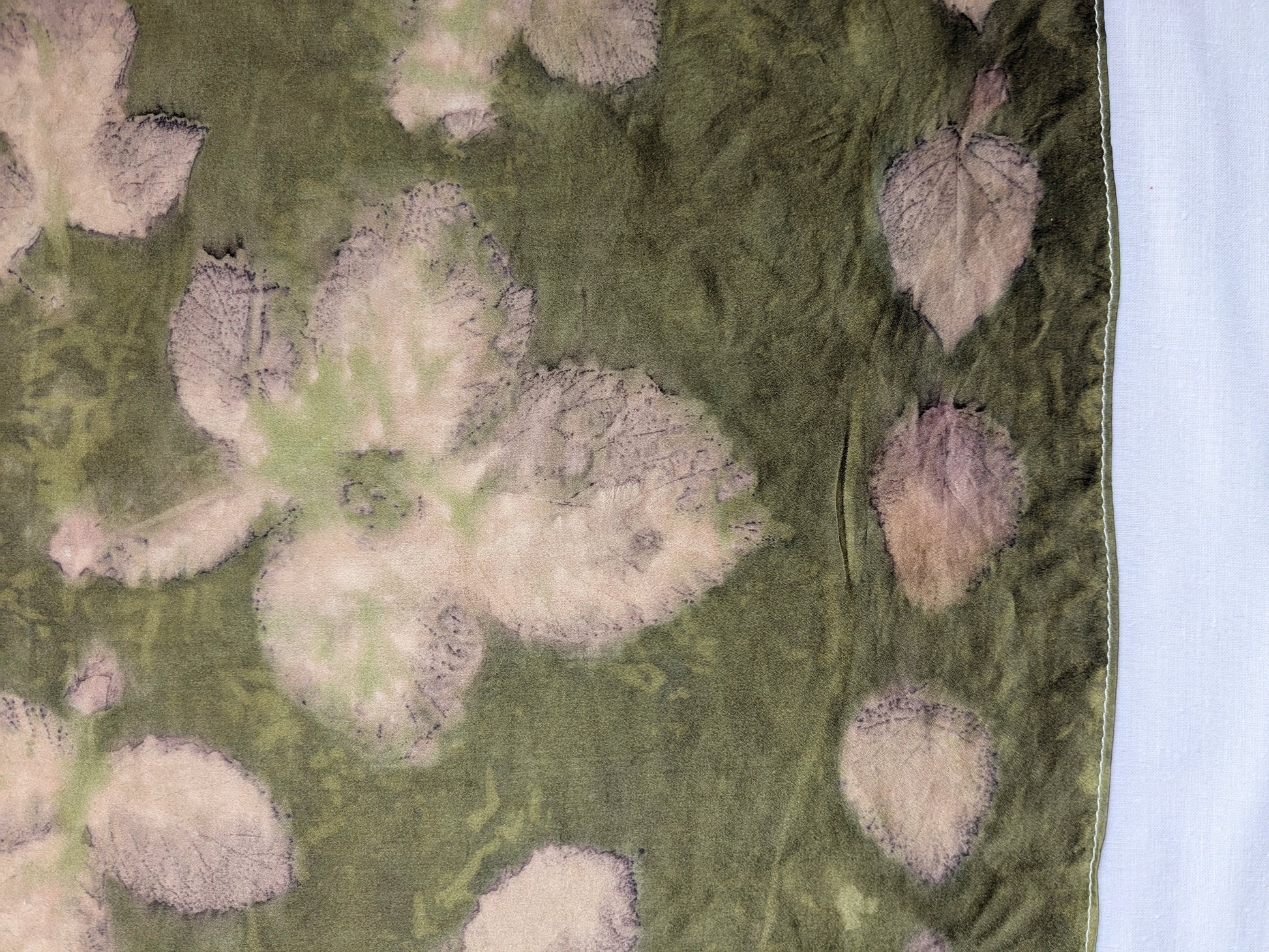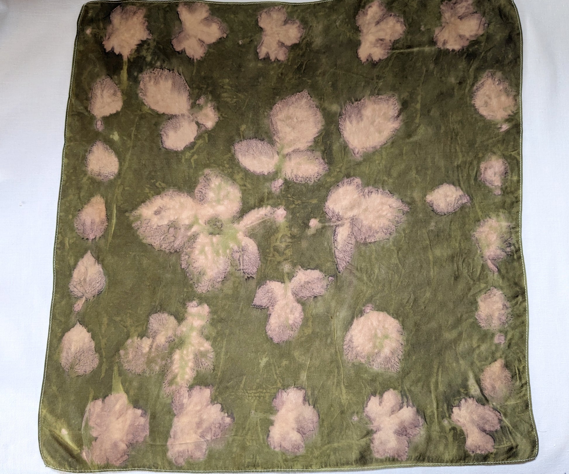შარფი დამზადებულია 100% ბუნებრივი აბრეშუმისგან და შეღებილია ნამდვილი მცენარეებისგან; აღბეჭდილია ასევე ნამდვილი, ჩემს ბაღში გაზრდილი მცენარეების ფოთლები და ყვავილები: მაყვლის ფოთლების ანაბეჭდი