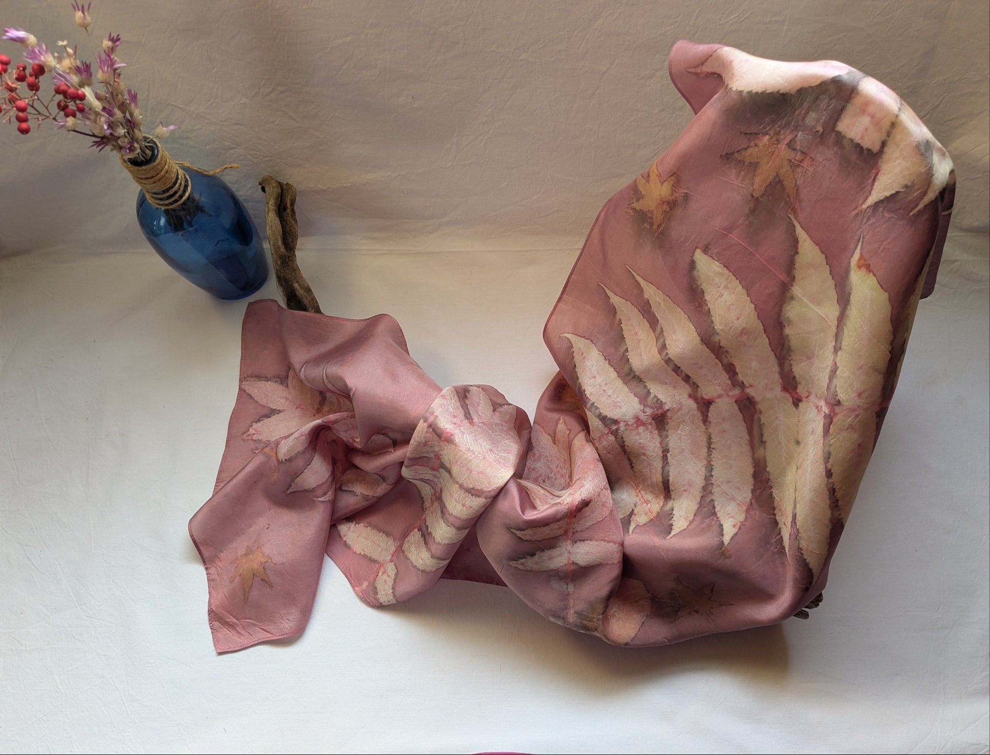 Our scarves are made from 100% natural silk and dyed with real plants grown in our garden. Each scarf is eco-printed with leaves and flowers, creating unique, one-of-a-kind botanical patterns. No two pieces are ever the same, making every scarf a wearable piece of art. Scarf is made from marigold flowers, cochineal and eco printed with sumac and smokebush leaves
