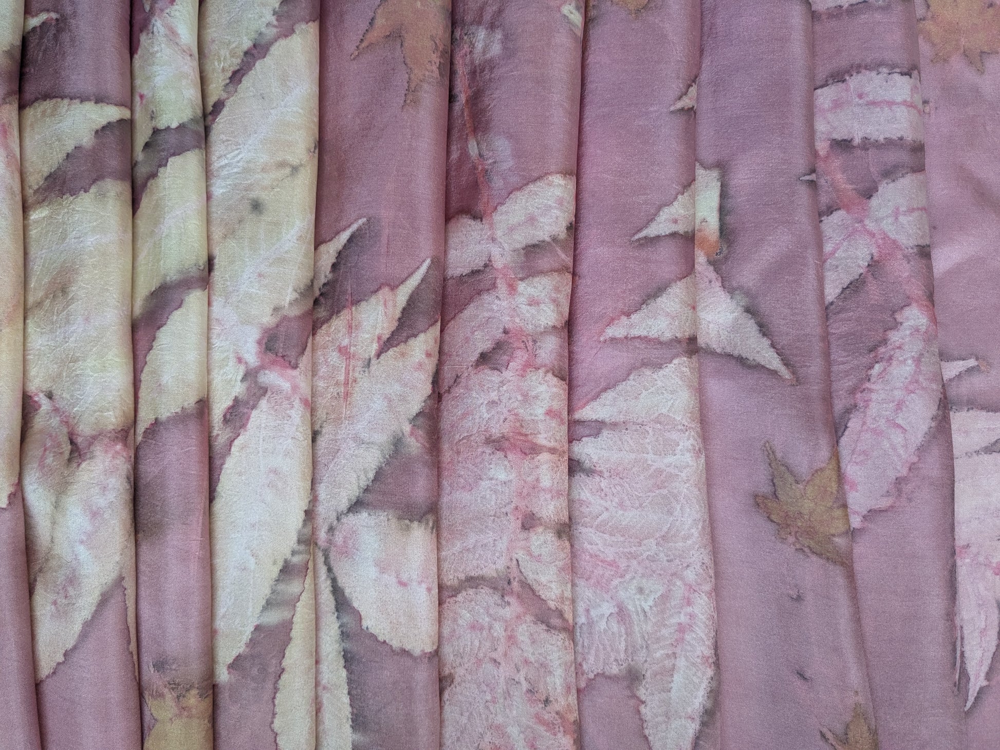 Eco printing is a plant-based dyeing process, during which, with the help of tannins present in the plant, the image of a real leaf is imprinted on the fabric. Each piece is handmade, each item is unique and does not repeat. It is a one-of-a-kind item. Absolutely all fabrics are natural fabrics, because plants do not print on polyester and artificial fabrics cannot be dyed with natural dyes.