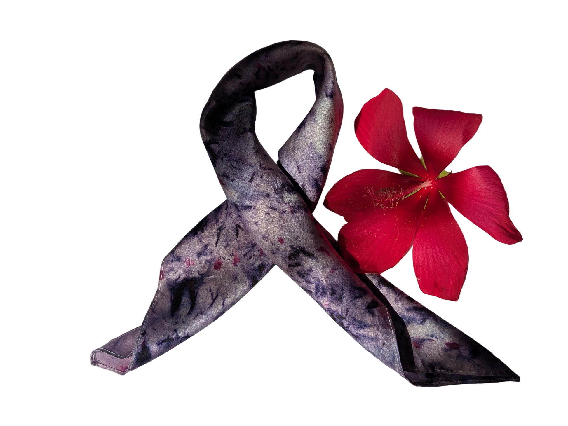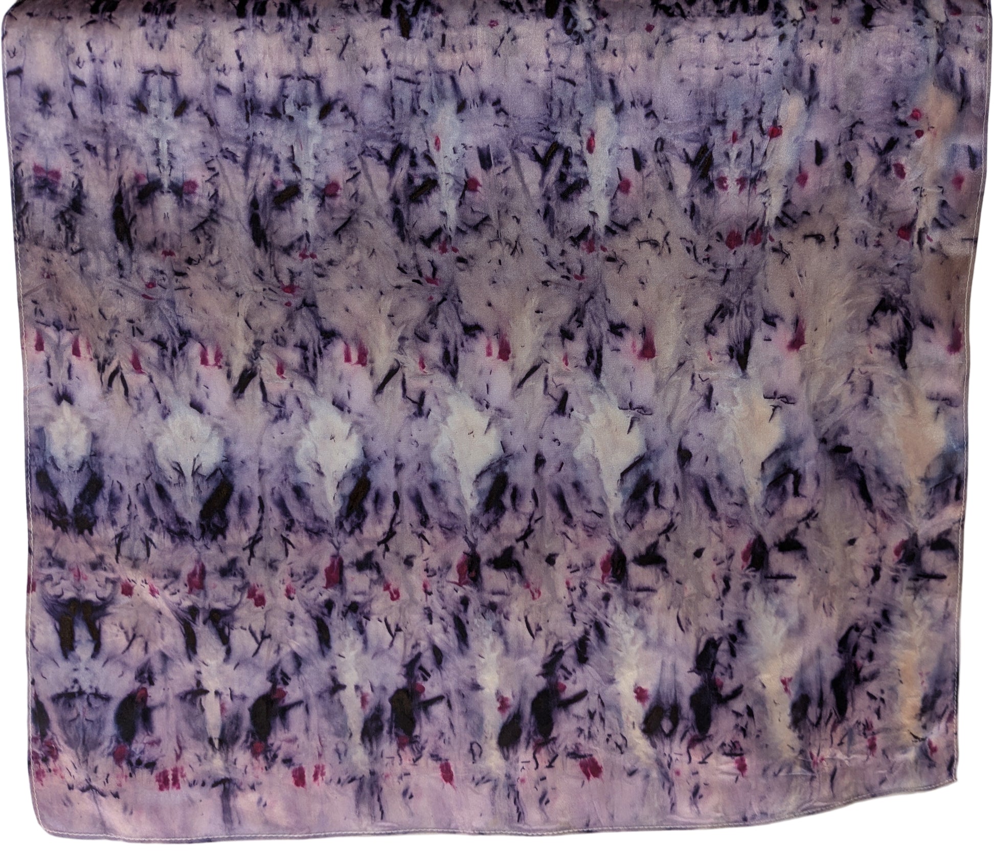 Our scarves are made from 100% natural silk and dyed with real plants grown in our garden. Each scarf is eco-printed with leaves and flowers, creating unique, one-of-a-kind botanical patterns. No two pieces are ever the same, making every scarf a wearable piece of art. Marigold dyed silk scarf, logwood and cochineal.