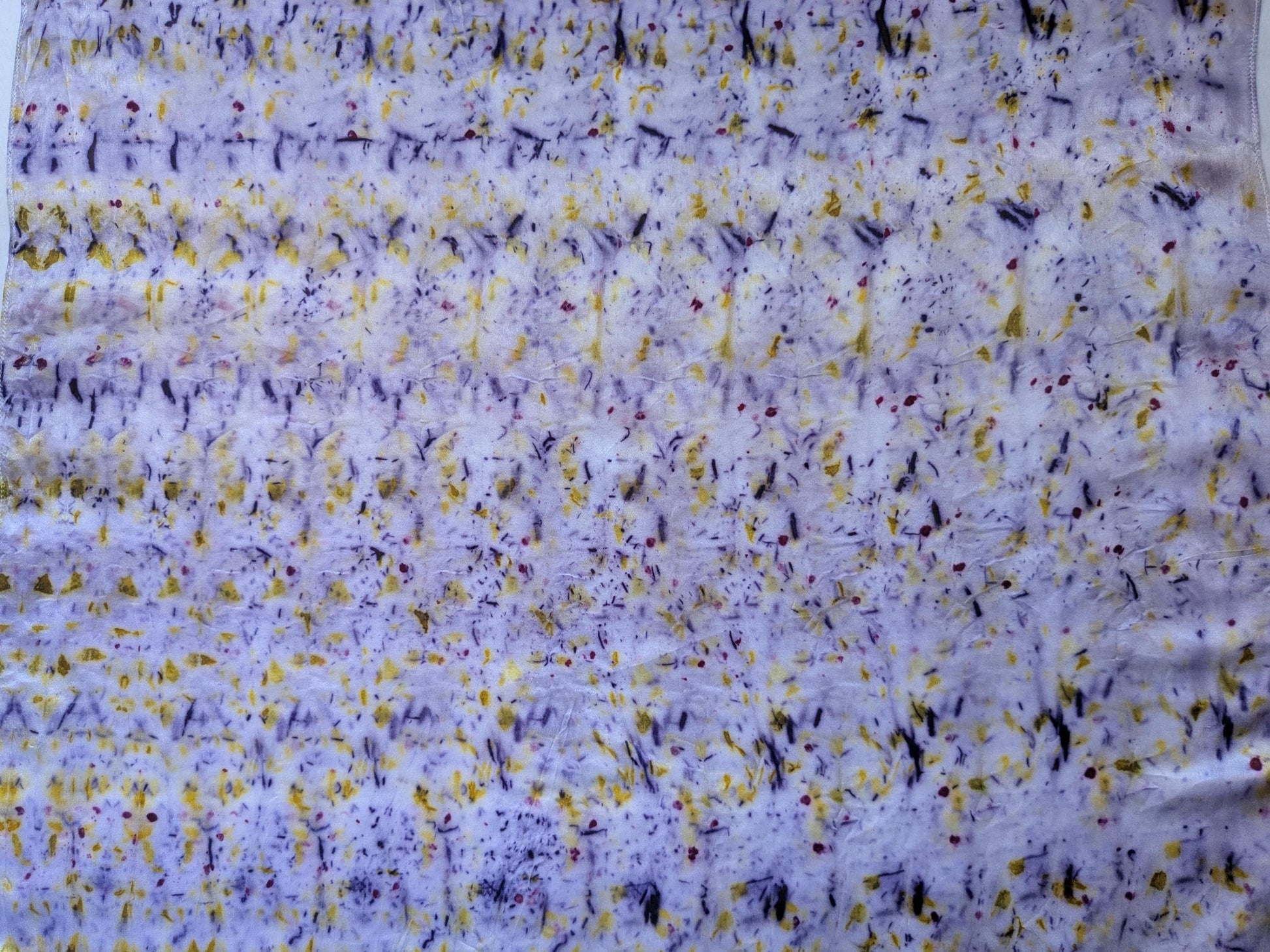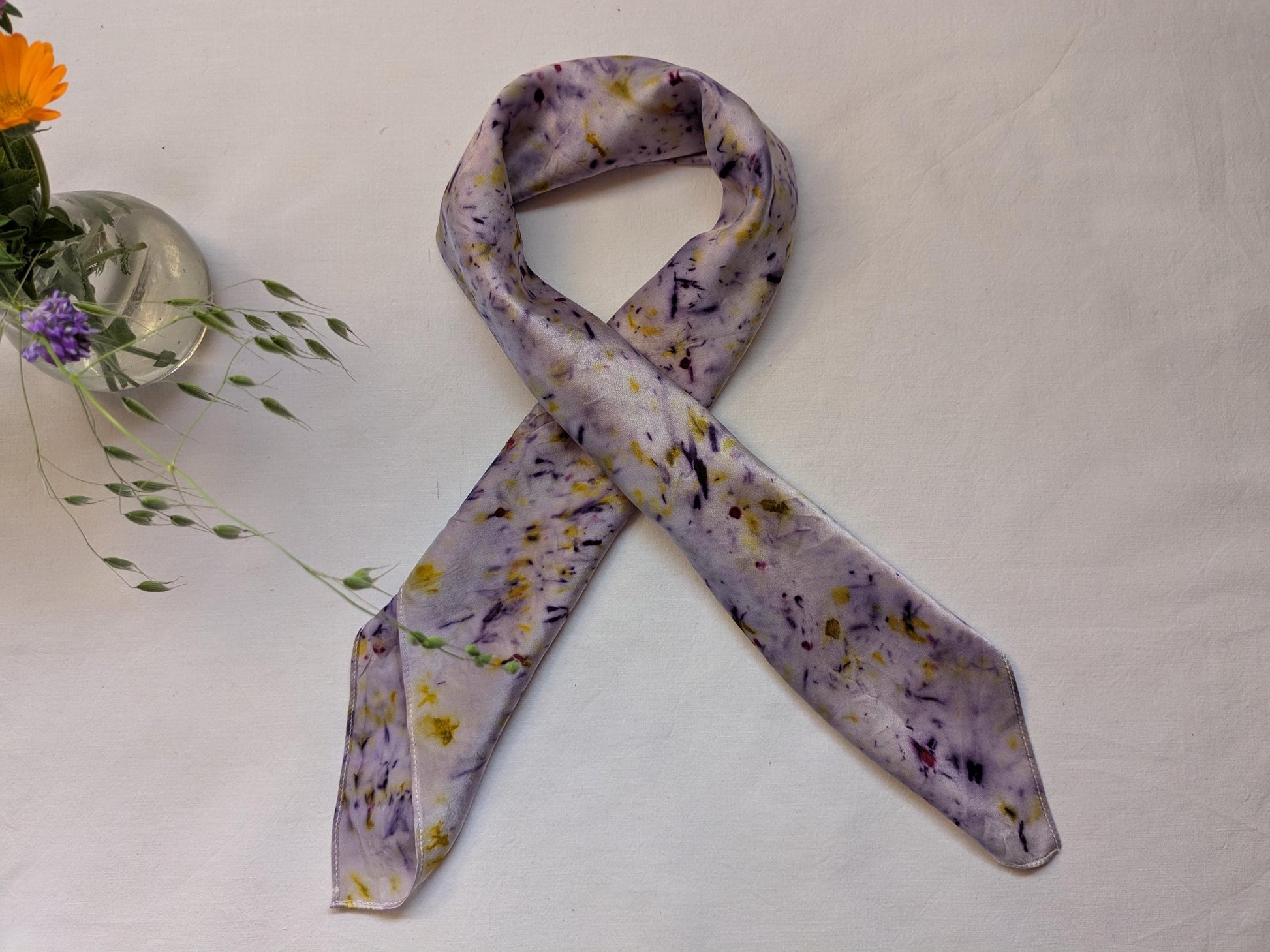 Our scarves are made from 100% natural silk and dyed with real plants grown in our garden. Each scarf is eco-printed with leaves and flowers, creating unique, one-of-a-kind botanical patterns. No two pieces are ever the same, making every scarf a wearable piece of art.