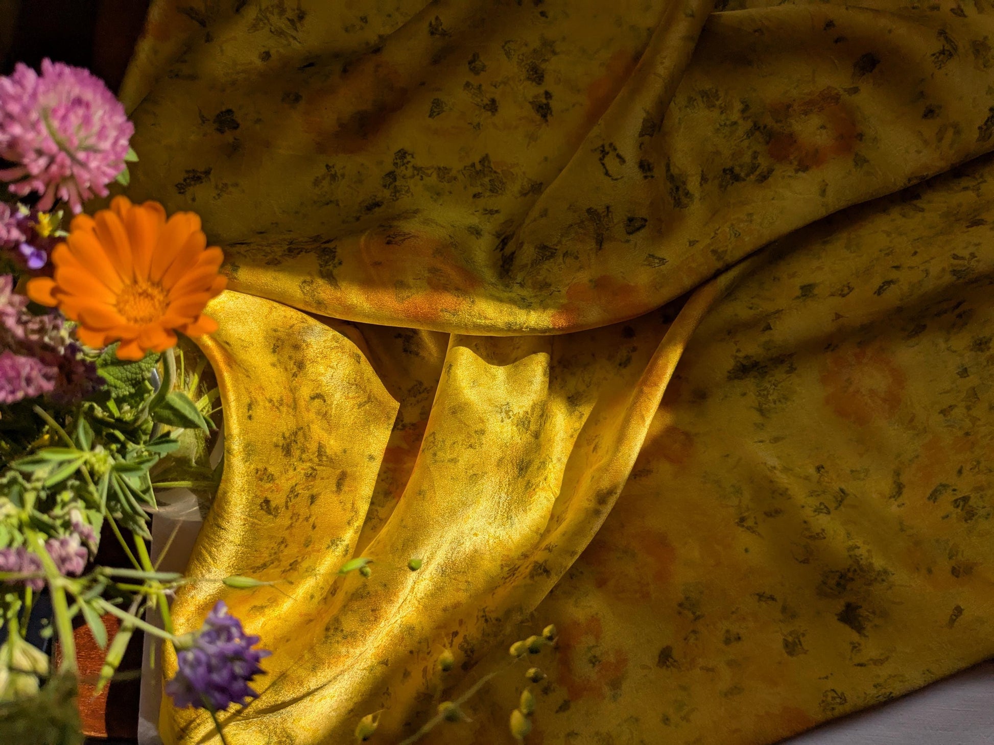 Eco Print Silk Scarf: Cosmos & Marigold Flowers, Boho Style