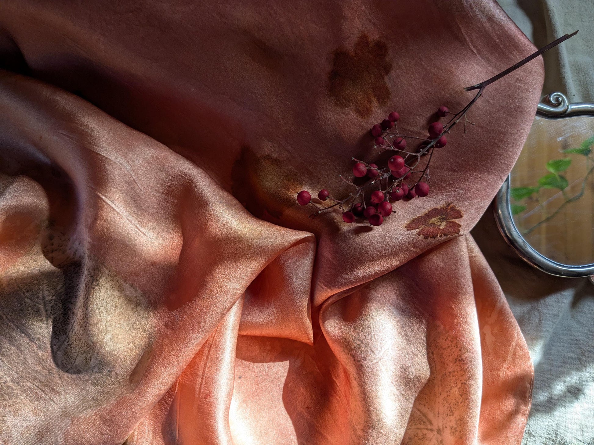 Our scarves are made from 100% natural silk and dyed with real plants grown in our garden. Each scarf is eco-printed with leaves and flowers, creating unique, one-of-a-kind botanical patterns. No two pieces are ever the same, making every scarf a wearable piece of art.