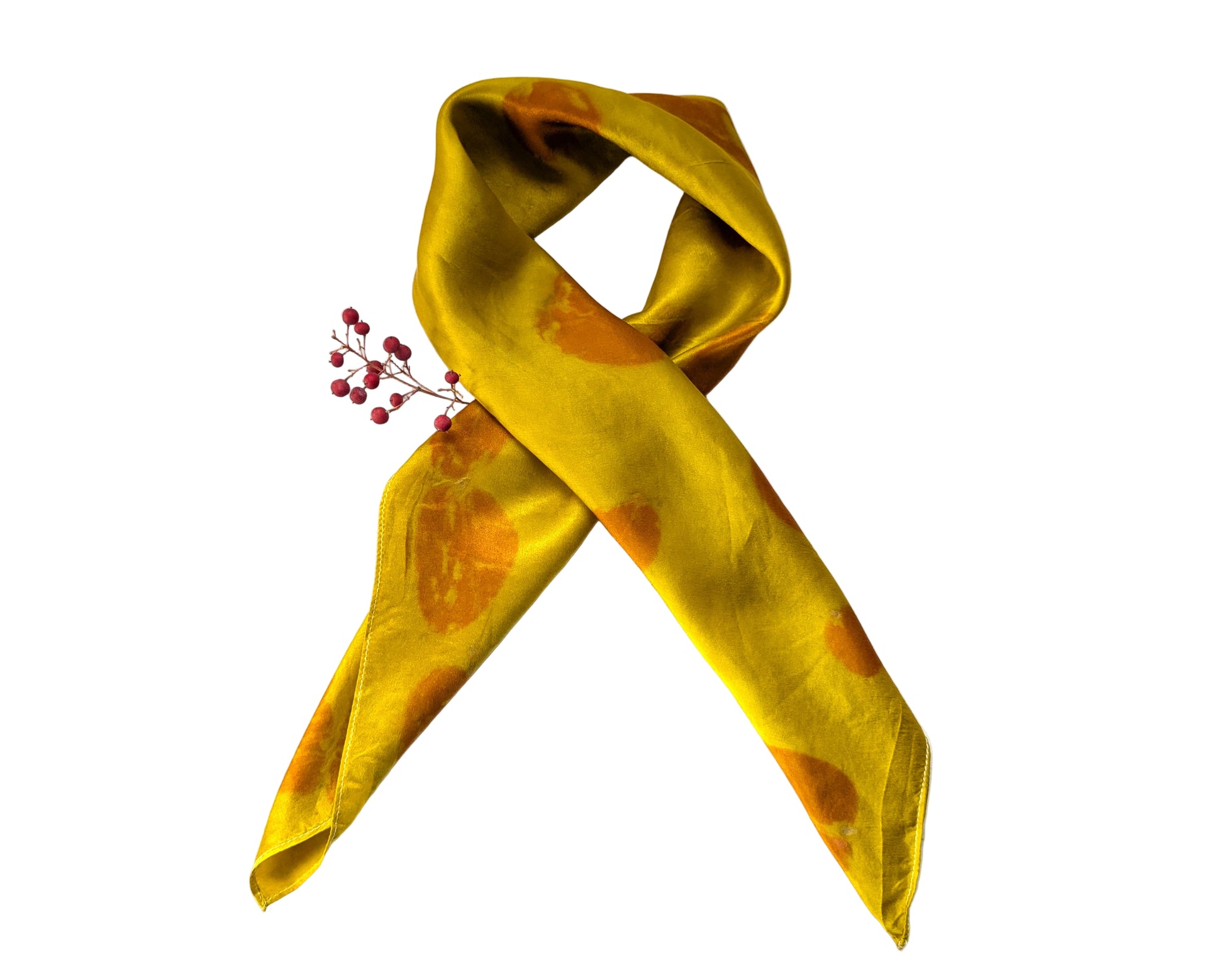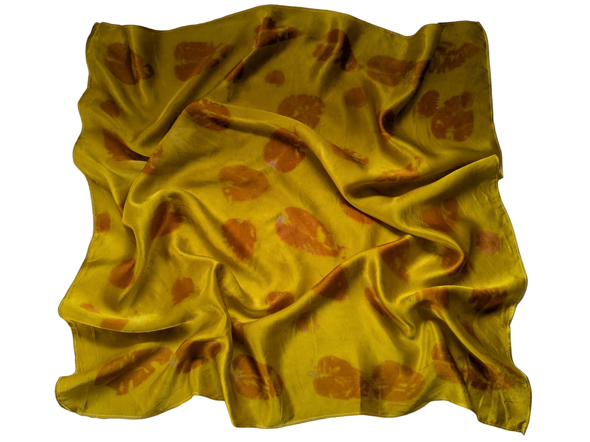 Our scarves are made from 100% natural silk and dyed with real plants grown in our garden. Each scarf is eco-printed with leaves and flowers, creating unique, one-of-a-kind botanical patterns. No two pieces are ever the same, making every scarf a wearable piece of art. Made with eucalyptus leaves and dyed with marigold flowers.