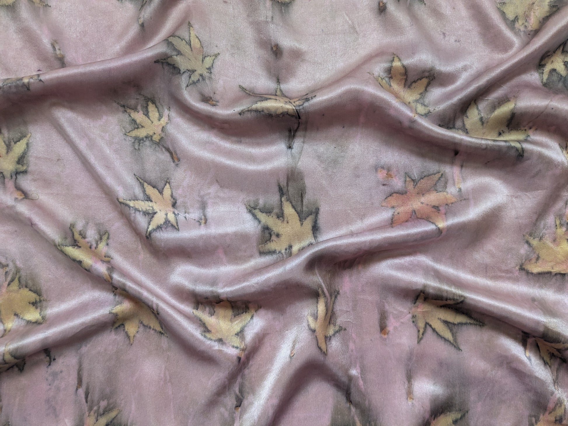 Our scarves are made from 100% natural silk and dyed with real plants grown in our garden. Each scarf is eco-printed with leaves and flowers, creating unique, one-of-a-kind botanical patterns. No two pieces are ever the same, making every scarf a wearable piece of art. Eco printed natural silk satin scarf, maple leaves, dyed with cochineal.
