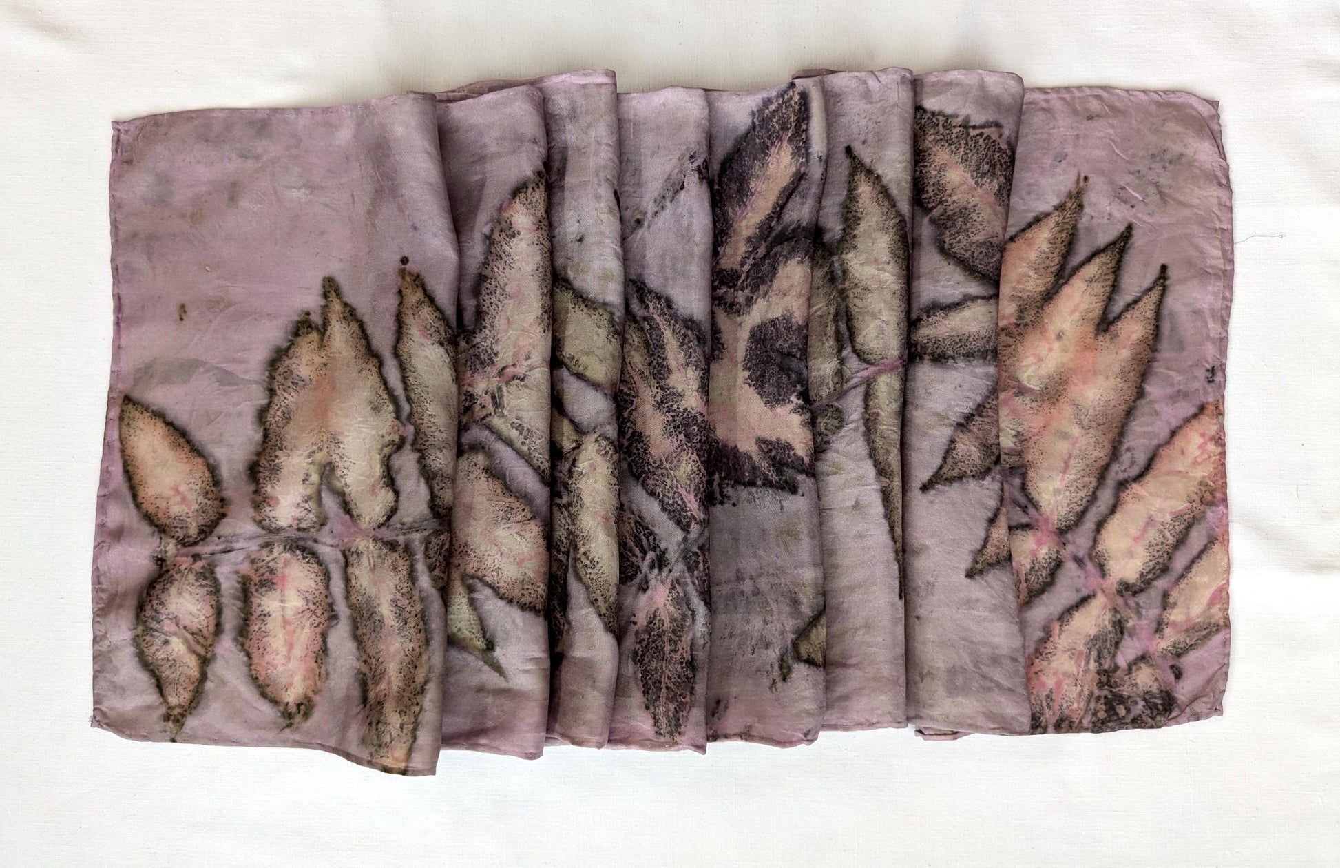 Our scarves are made from 100% natural silk and dyed with real plants grown in our garden. Each scarf is eco-printed with leaves and flowers, creating unique, one-of-a-kind botanical patterns. No two pieces are ever the same, making every scarf a wearable piece of art.