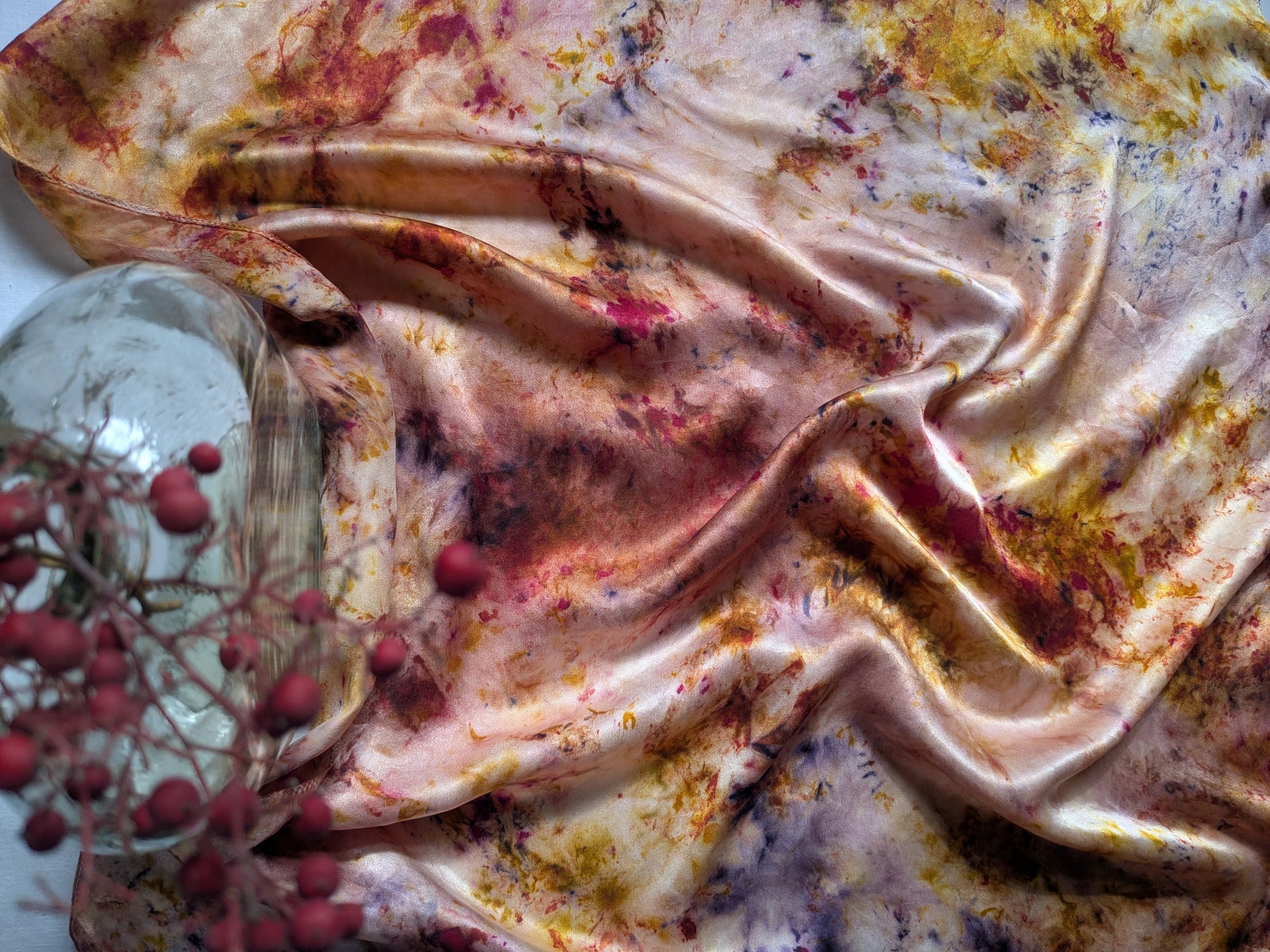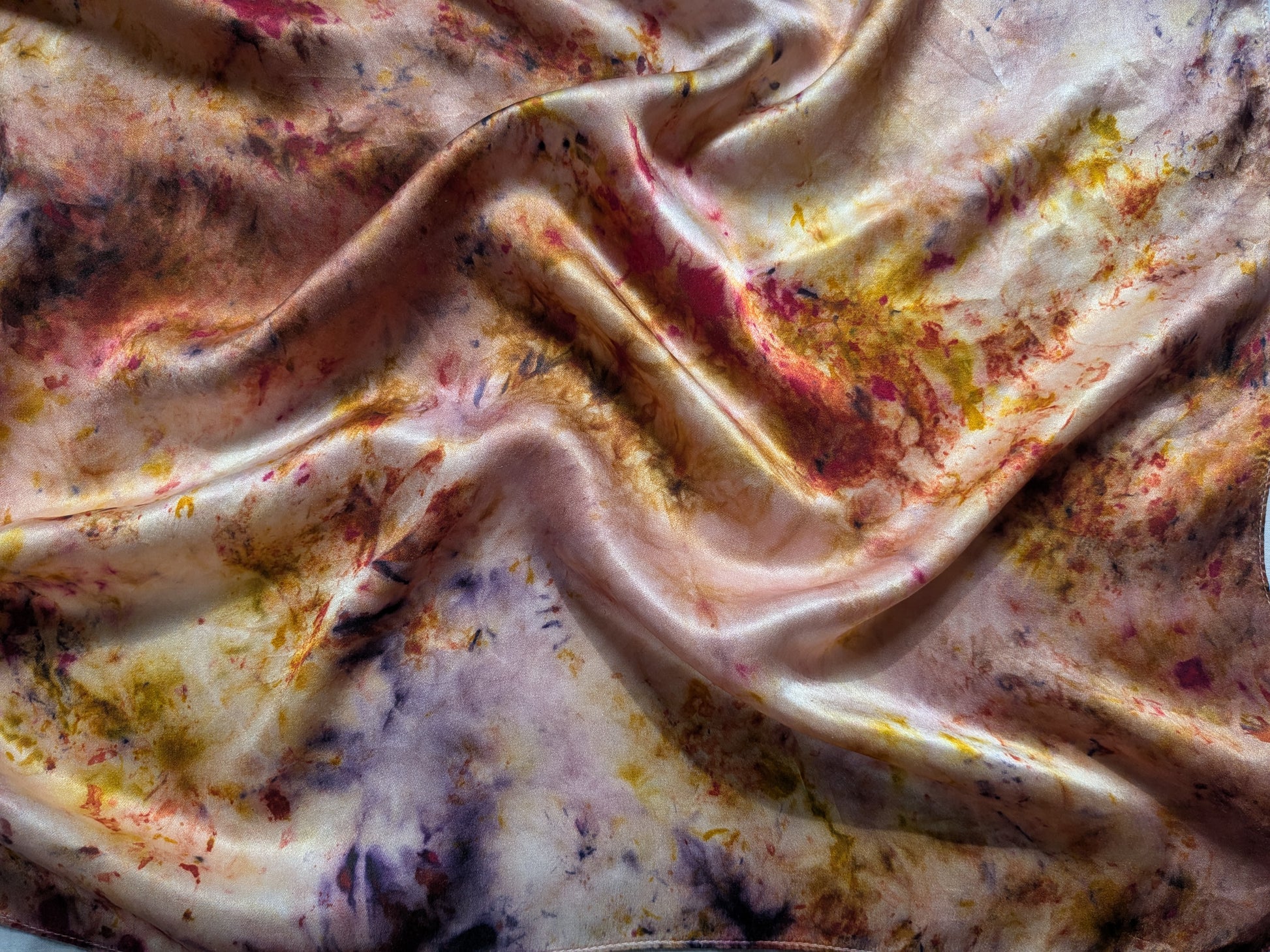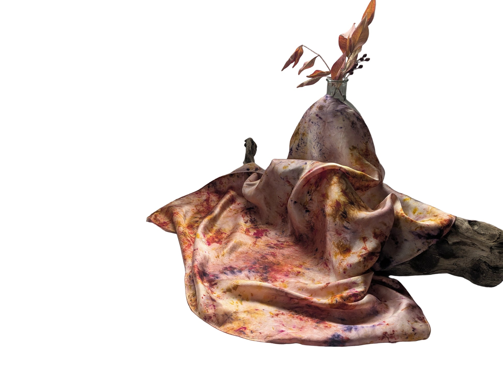 Our scarves are made from 100% natural silk and dyed with real plants grown in our garden. Each scarf is eco-printed with leaves and flowers, creating unique, one-of-a-kind botanical patterns. No two pieces are ever the same, making every scarf a wearable piece of art. Naturally dyed with logwood, madder, marigolds and cochineal.