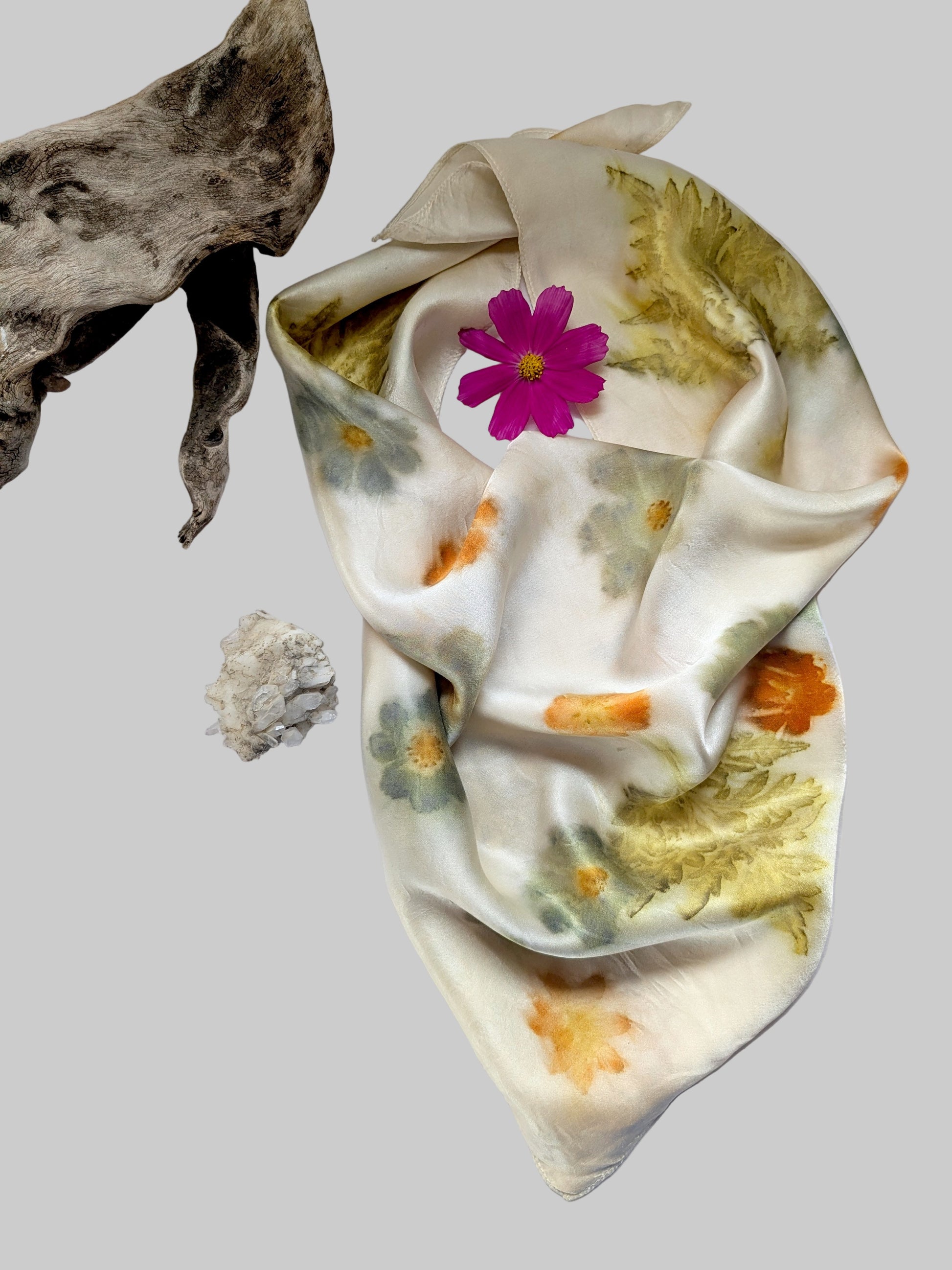 Our scarves are made from 100% natural silk and dyed with real plants grown in our garden. Each scarf is eco-printed with leaves and flowers, creating unique, one-of-a-kind botanical patterns. No two pieces are ever the same, making every scarf a wearable piece of art. Cosmos flowers and leaves are used for this scarf.