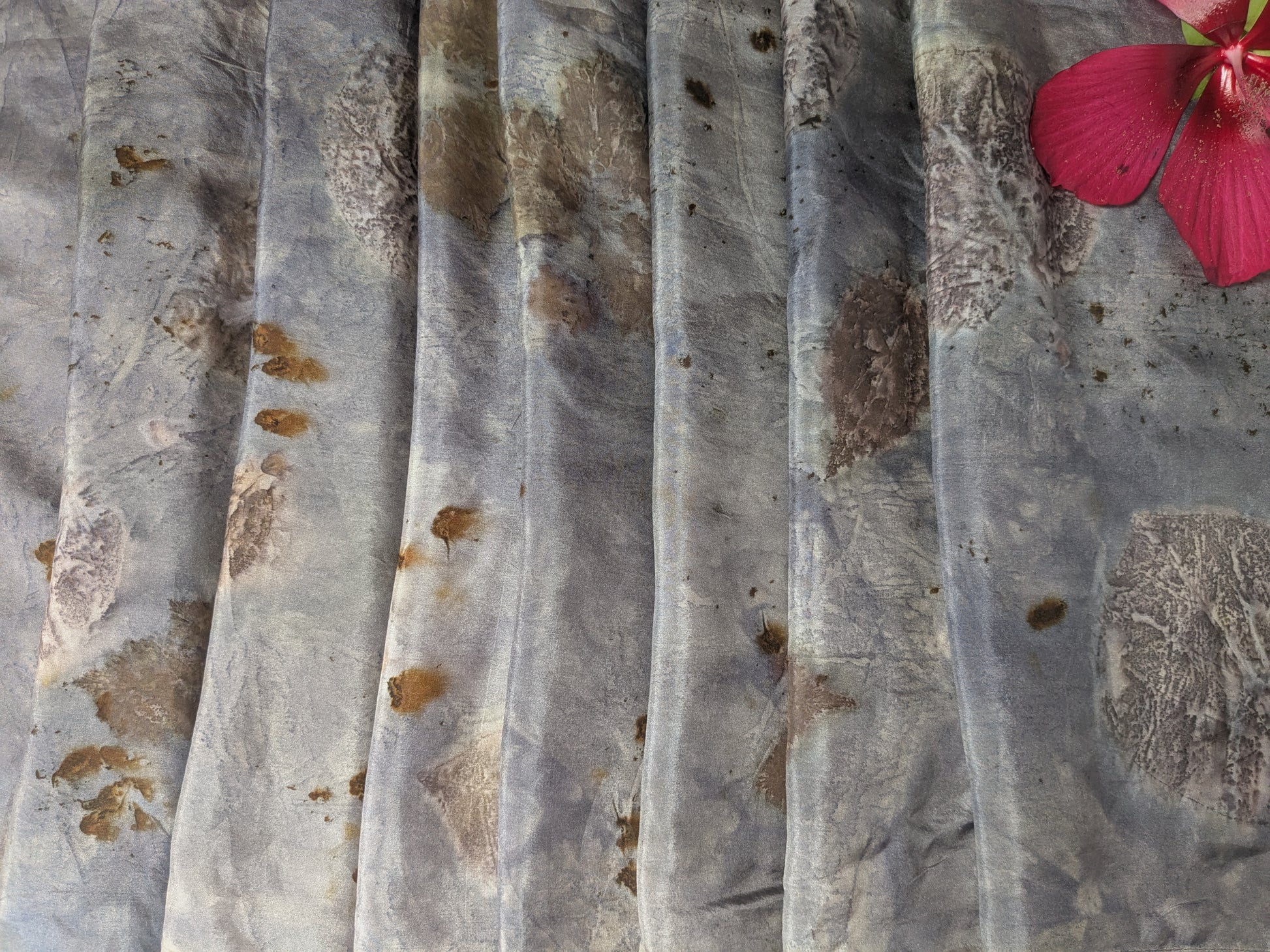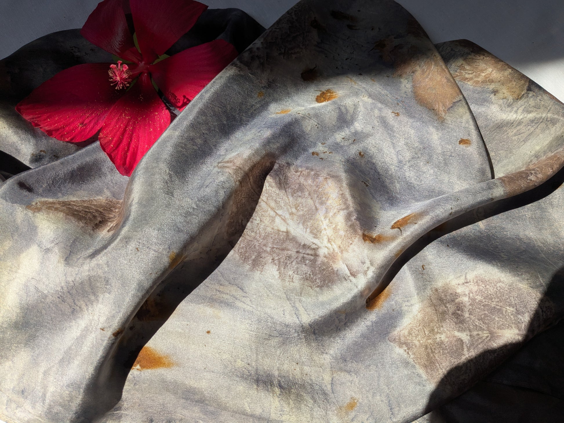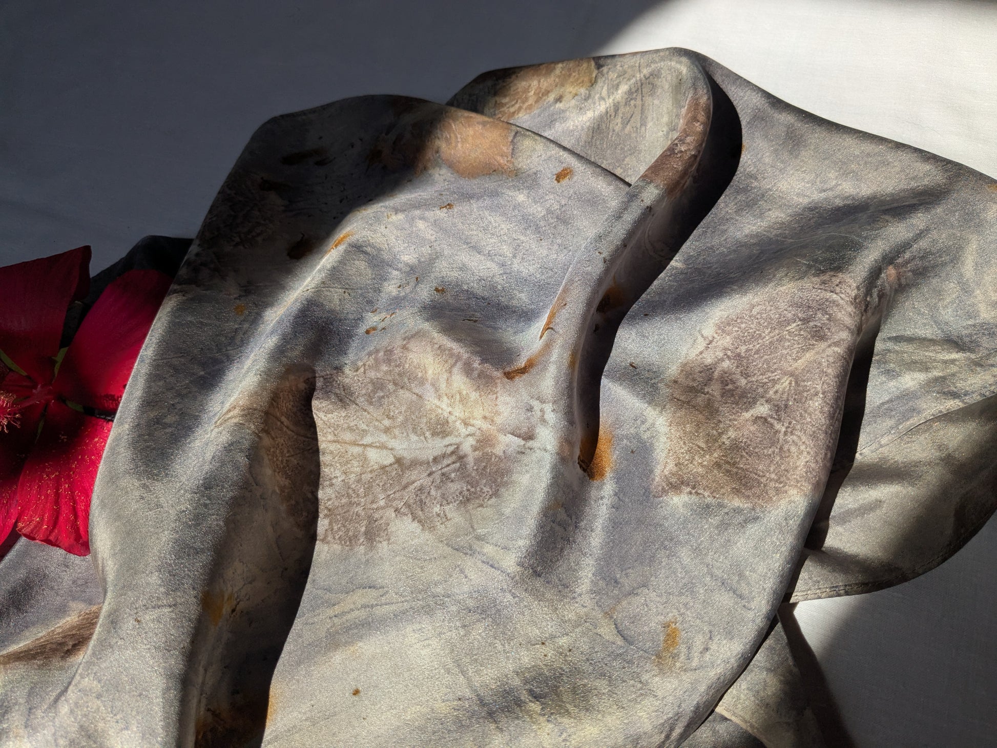 Our scarves are made from 100% natural silk and dyed with real plants grown in our garden. Each scarf is eco-printed with leaves and flowers, creating unique, one-of-a-kind botanical patterns. No two pieces are ever the same, making every scarf a wearable piece of art. Scarf is made from logwood dye and eco printed with various leaves