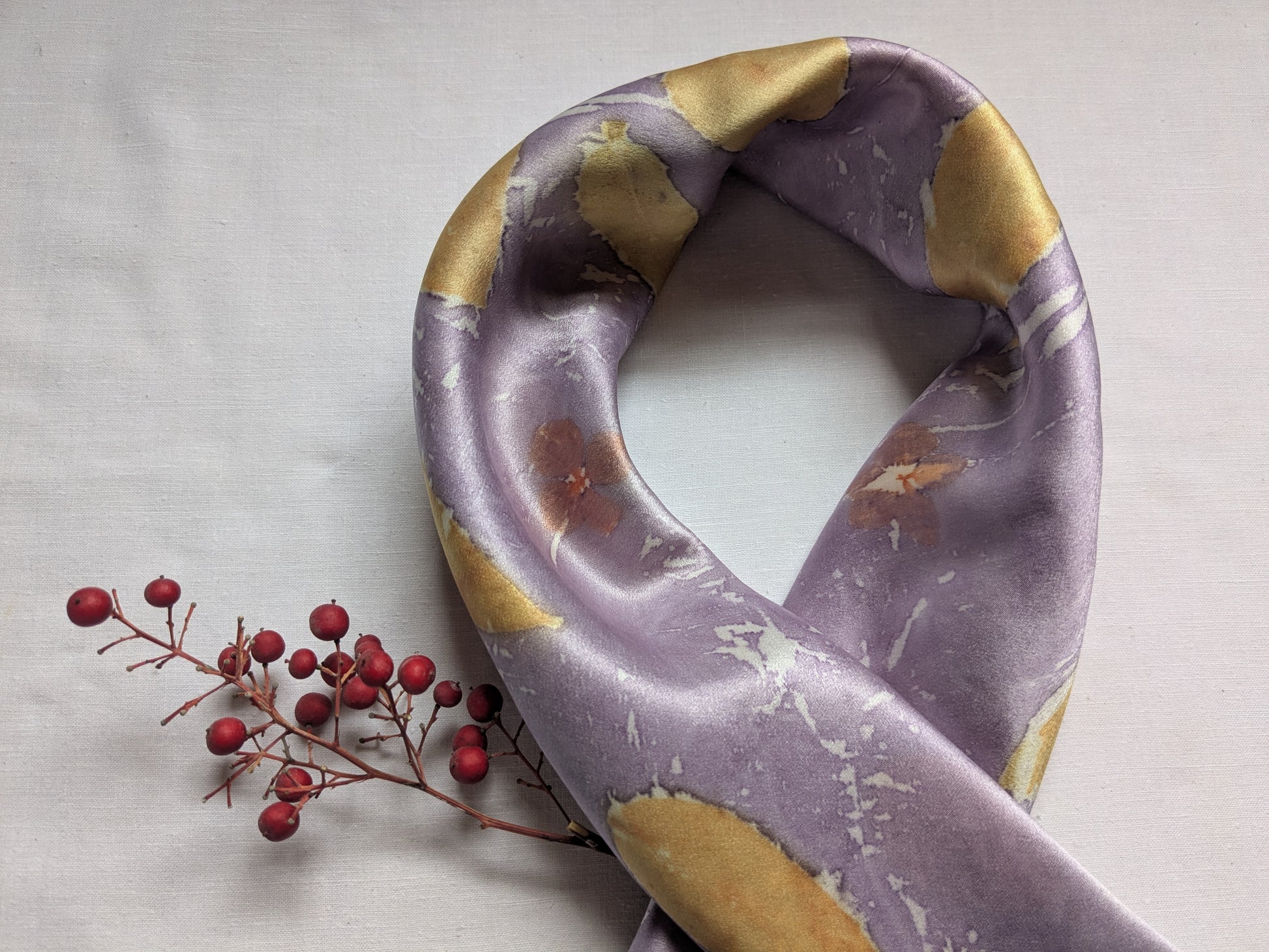 Our scarves are made from 100% natural silk and dyed with real plants grown in our garden. Each scarf is eco-printed with leaves and flowers, creating unique, one-of-a-kind botanical patterns. No two pieces are ever the same, making every scarf a wearable piece of art. Naturally dyed with logwood dye and eco printed with eucalyptus leaves.