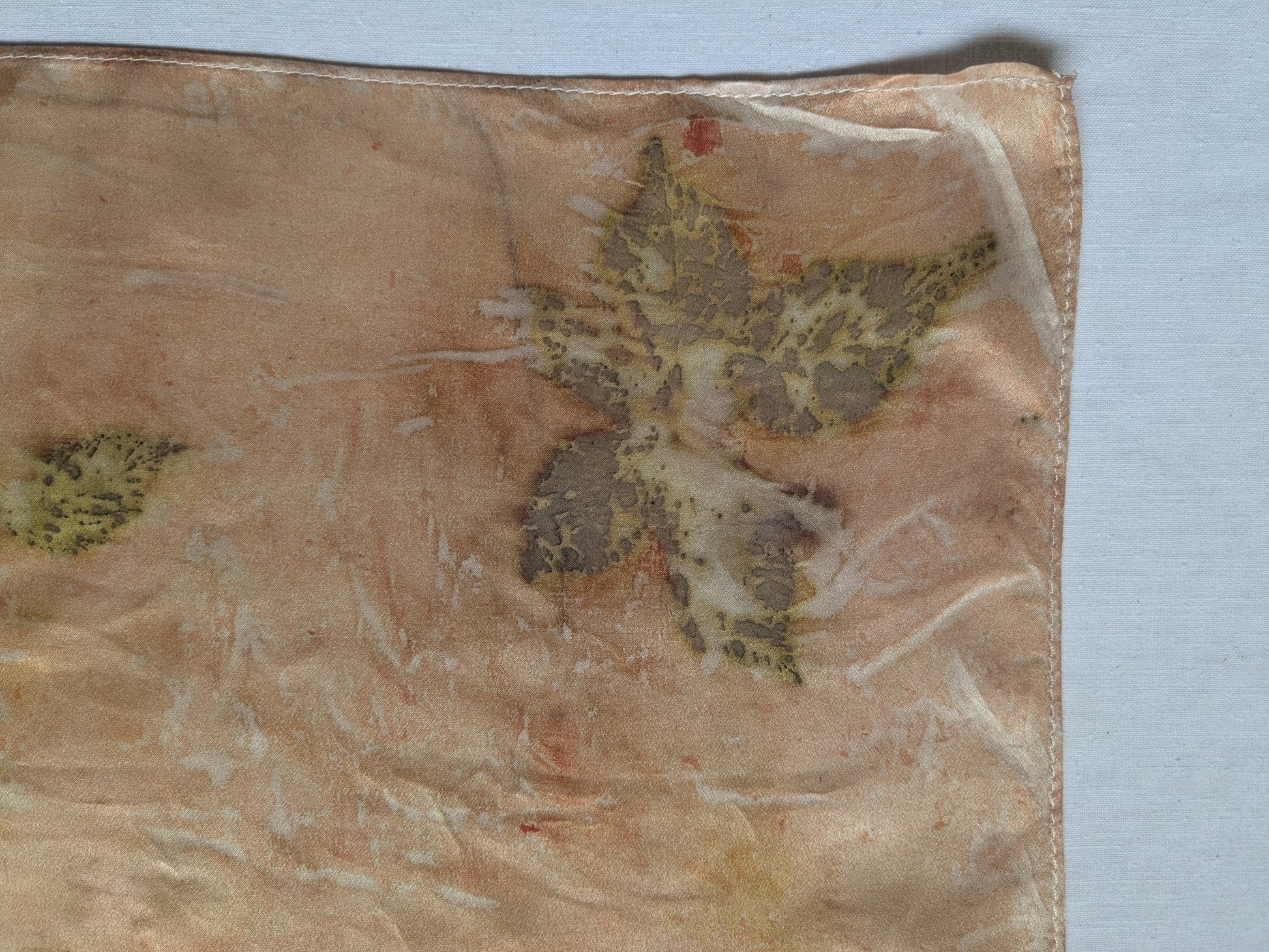 Our scarves are made from 100% natural silk and dyed with real plants grown in our garden. Each scarf is eco-printed with leaves and flowers, creating unique, one-of-a-kind botanical patterns. No two pieces are ever the same, making every scarf a wearable piece of art. Eco printed natural silk satin scarf, blackberry leaves, dyed with madder root.