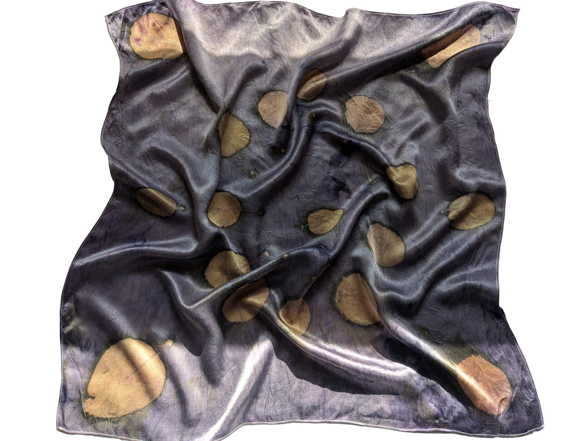 Our scarves are made from 100% natural silk and dyed with real plants grown in our garden. Each scarf is eco-printed with leaves and flowers, creating unique, one-of-a-kind botanical patterns. No two pieces are ever the same, making every scarf a wearable piece of art. Naturally dyed logwood and eco printed with smokebush leaves.