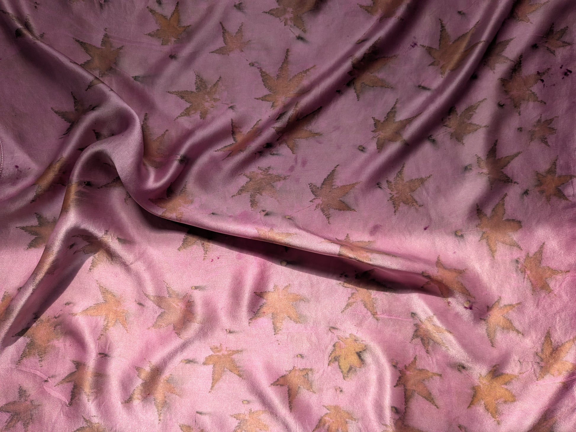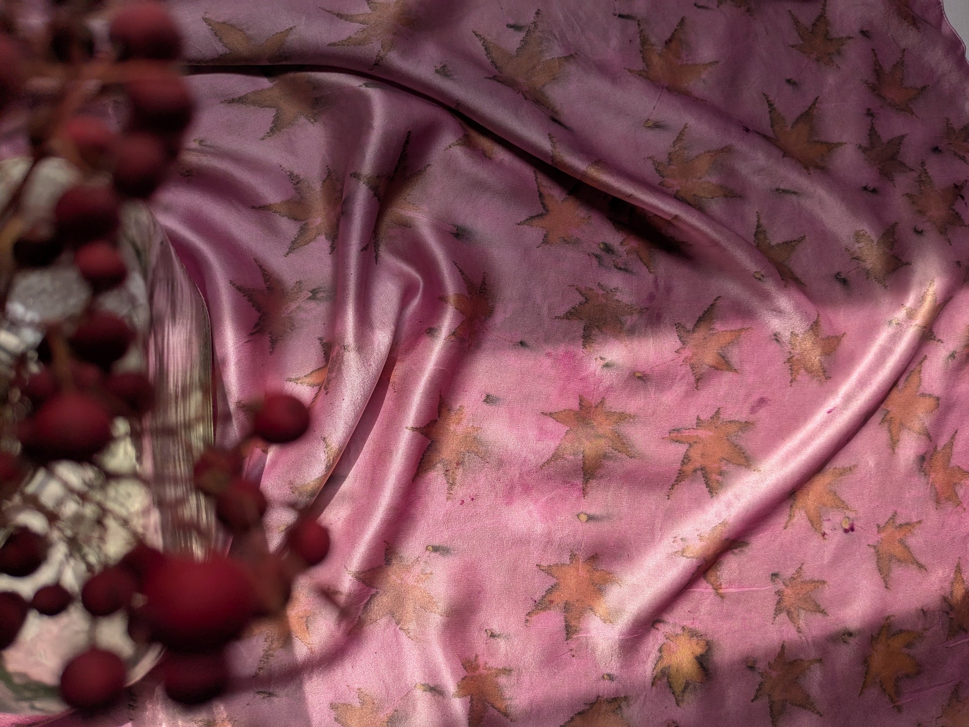Our scarves are made from 100% natural silk and dyed with real plants grown in our garden. Each scarf is eco-printed with leaves and flowers, creating unique, one-of-a-kind botanical patterns. No two pieces are ever the same, making every scarf a wearable piece of art. Naturally dyed with cochineal dye and eco printed with maple leaves.