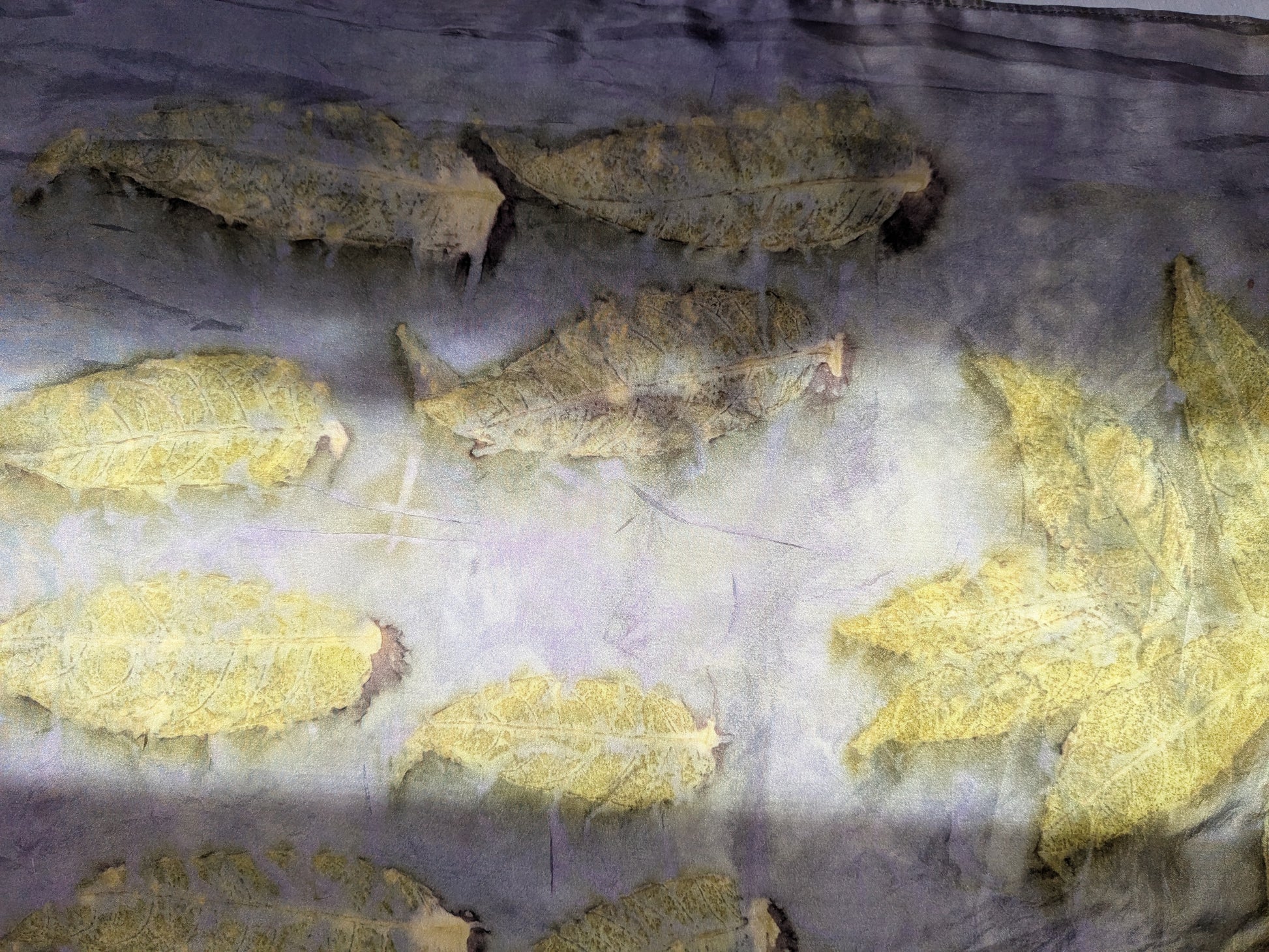 Our scarves are made from 100% natural silk and dyed with real plants grown in our garden. Each scarf is eco-printed with leaves and flowers, creating unique, one-of-a-kind botanical patterns. No two pieces are ever the same, making every scarf a wearable piece of art. Scarf is made from logwood dye and eco printed with sumac leaves